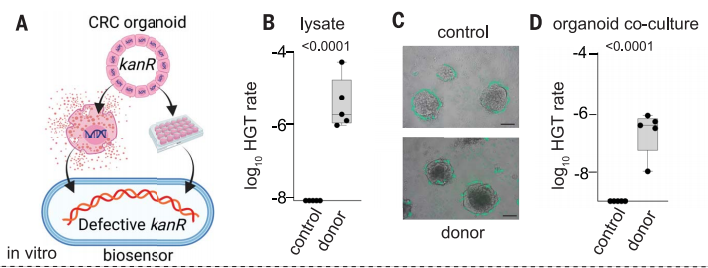 接下来,作者在类器官培养中评估传感器(下图A)。结果显示,与结直肠癌细胞系一样,贝氏不动杆菌传感器纳入了来自供体类器官裂解液的DNA,而不是来自亲本类器官的对照裂解液(图B)。当共培养表达GFP的传感器与亲代或供体类器官一起在Matrigel上培养24小时,传感器细菌包裹了类器官(图C)。在与供体(而非亲本)类器官共培养后,传感器细菌通过HGT获得了供体DNA(图D)。