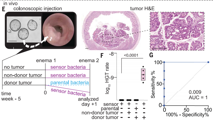 鉴于癌症-细菌HGT发生在体外和粪便中,下一步作者试图在体内测试CATCH系统。通过小鼠结肠镜将工程CRC供体类器官或非供体类器官原位注射到免疫缺陷NSG小鼠结肠中形成结肠肿瘤,肿瘤会将肿瘤DNA释放到结直肠管腔中。在第5周,传感器(或亲代)经直肠灌肠两次给药,并对管腔流出物进行分析(下图F)。