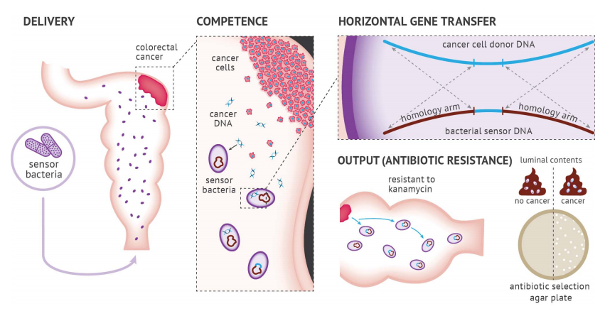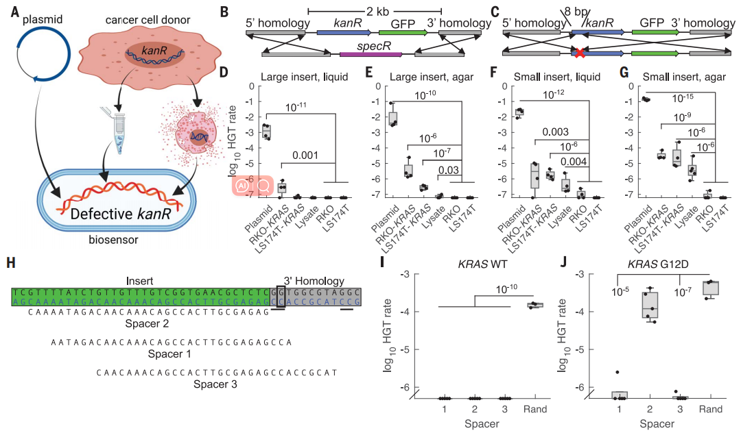 工程贝氏不动杆菌在直肠癌原位小鼠模型中经直肠输送。自然感受态的贝氏不动杆菌会接受从肿瘤脱落进入结直肠腔的DNA。肿瘤供体DNA被设计成在KRAS同源臂内插入了卡那霉素耐药基因(kanR)。传感器细菌被设计成具有匹配的KRAS同源臂,促进同源重组。从肿瘤DNA中接受HGT的传感器细菌会获得卡那霉素耐药性,并通过抗生素平板连续稀释进行定量。