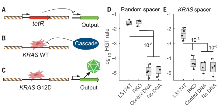 作者又通过一系列令人眼花缭乱的设计使传感器细菌会通过CRISPR介导的DNA降解来拒绝野生型KRAS,但允许KRASG12D序列的整合(下图I和J)。因此,传感器贝氏不动杆菌可以被改造成检测具有单碱基特异性的KRAS基因的突变热点。