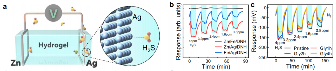 H2S处理下,Zn/Ag/DNH、Fe/Ag/DNH和Zn/Fe/DNH的动态响应曲线如图b所示。随着H2S浓度的增加,Zn/Ag/DNH和Fe/Ag/DNH的OCV均发生了显著变化,且响应增强,而Zn/Fe/DNH的OCV几乎没有变化。当水凝胶中的部分水被Gly取代时,响应降低,Gly4h-DNO的响应最小。因此选择Gly1h-DNO作为传感器的构建材料,后将其直接称为DNO。