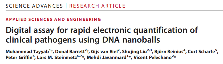 通过测量阻抗变化进行电化学检测DNA扩增是一个无标记替代荧光和比色技术。基于阻抗的生物传感器已广泛用于各种分析物,包括具有高灵敏度的蛋白质、核酸和癌细胞。此外,由于近几十年来的技术进步,电子元件经历了快速的小型化,大量减少的体积输入要求进一步提高了即时检测(POC)的可能性。 近日,一组由美国、中国、瑞典等多所顶尖大学研究团队在Science Advances杂志上发表了一篇题为“Digital assay for rapid electronic quantification of clinical pathogens using DNA nanoballs”的文章。在文章中,作者开发了一种简化的one-pot核酸等温扩增方法,可以通过电阻抗的变化来检测,而不需要微珠作为外部成核剂。作者改进了RT-LAMP反应,使扩增的DNA自核成纳米球,在微流体通道中,被动流动通过两个检测电极,在阻抗信号中产生量化尖峰。作者将其应用于SARS-CoV-2的检测,检测到的尖峰的数量与扩增DNA的数量相对应,因此病毒浓度更高。还展示了多种DNA和RNA致病序列的检测,包括来自各种病毒和细菌病原体序列,包括HIV、流感、结核分枝杆菌和β-内酰胺酶。这种技术为一种新的、简单的基于阻抗的多病原体POC核酸检测系统铺平了道路。 图片来源:Science Advances 自组装DNA纳米球 为了简化基于阻抗的DNA检测,作者开发了一种能够在一锅反应中生成DNA纳米球的分子方法,并且不需要外部成核剂。受先前滚动圈扩增(RCA)工作的启发,作者改进了LAMP反应,设计标准的六个目标特异性LAMP引物和两个额外的compaction引物,使扩增的DNA自核成纳米球,且纳米球的产生与等温DNA扩增平行(下图A)。当使用SARS-CoV-2 RNA测试此RT-LAMP反应时,可以在荧光显微镜下观察到自组装紧凑的DNA纳米球,直径从1到2 μm(下图B和C)。 DNA纳米球的自组装。图片来源:Science Advances 微流控装置中的阻抗检测 作者将简单的微流控芯片放在带有金电极的玻璃基板上(下图A和B)。微流控芯片采用毛细管作用驱动的被动流动,从而消除了复杂的微流控管和泵的需要。这种简单的被动流动使DNA纳米球通过的金电极上方的通道(下图D)并连接到电子读出系统。当纳米球通过金电极时,它会阻塞两个电极之间的电流路径和电场。这会产生阻抗的变化,从而在读出系统的输出处产生类似于图C至E所示的峰值特征。接下来,作者尝试改变compaction引物相对于LF和LB引物的浓度。结果显示使用更高比例的compaction引物 (9:1)产生更高的DNA纳米球数量(平均10分钟>100个),因此在接下来的实验中都使用了这个比例。 基于阻抗检测DNA纳米球的微流控芯片。 图片来源:Science Advances 检测限 研究团队以合成RNA为模板进行了梯度稀释实验,探索了该方法的检出限(LOD)。结果显示,即使是最低浓度的合成RNA测试(10拷贝RNA)也很容易与阴性对照区分开(下图A)。作者还在不同的时间间隔(5分钟、3分钟、60秒和30秒),测试了缩短电检测时间对LOD的影响。结果显示,即使在30秒,检测到的纳米球数量分布与初始合成RNA的浓度密切相关,并且在阴性对照组之间表现出统计学上的显著差异(下图B)。 检测限的分析。图片来源:Science Advances 三重复compaction引物设计导至信号增强 为了进一步提高系统的DNA检测能力,作者采用了几种策略。首先尝试增加DNA纳米球的大小或改变其电性能可能会增加信噪比,从而提高可探测性。为了增加DNA纳米球的大小,作者在compaction引物中添加一个额外的共同序列拷贝可能会增强LAMP扩增子压缩和形成纳米球的能力。结果证实了作者的推断,三重复compaction引物设计大大增加了检测到的平均DNA纳米球数量,从使用两重复compaction引物时的大约2000个增加到接近3000个(下图B)。 DNA纳米球检测实验方案的优化。 图片来源:Science Advances 临床样本中SARS-CoV-2的阻抗检测 为了测试此方法的适用性,接下来将其应用于检测来自临床诊断测试的上呼吸道拭子样本中的SARS-COV-2。随机选择了5个不同病毒载量的样本,通过RT-qPCR测量:低病毒载量(Ct 26-27),中病毒载量(Ct 22-24)和高病毒载量(Ct 17-20),并使用此纳米球方法进行检测。结果(下图A)证明了基于阻抗的检测在非提取的热灭活样品中检测临床相关病毒水平的能力,且病毒载量与检测到的DNA纳米球数量之间存在很强的关系。在Ct值(27到17)范围内检测到1000到2000个DNA纳米球。更重要的是,从SARS-COV-2阴性患者中检测到的阻抗峰值水平较低,尽管这些样本中的材料(咽拭子、鼻拭子和唾液)基质很复杂。 对COVID-19患者进行临床样本检测。 图片来源:Science Advances 利用DNA纳米球灵活检测病原体 为了证明此检测的灵活性和易用性,作者设计了针对多种病原体的LAMP三重复compaction引物,其中包括抗结核分枝杆菌、艾滋病毒、流感A/H1N1,以及一种常见的产生抗微生物药物耐药性的β-内酰胺酶基因。如下图B所示,使用所选病原体的合成遗传物质进行RT-LAMP(或LAMP)反应时成功检测到DNA纳米球。所有目标检测到的峰值均接近1000个,与阴性对照显著不同。这证明了将任何LAMP反应与基于阻抗的检测相结合的策略相适应的便利性。 对多种病原体序列进行临床样本检测。 图片来源:Science Advances 总结与讨论 研究团队提出了一种结合一锅等温生成DNA纳米球和电阻抗检测的新方法。通过使用compaction引物来改进环介导的等温扩增,扩增的靶标可以自组装成纳米球。接下来使用毛细管驱动的流动被动地让这些纳米球通过两个检测电极,在阻抗信号中产生量化尖峰。这种