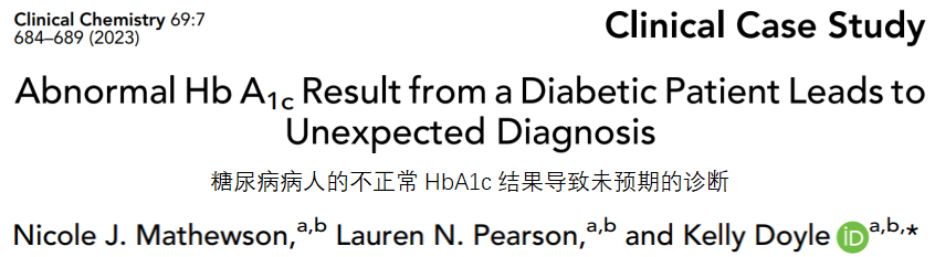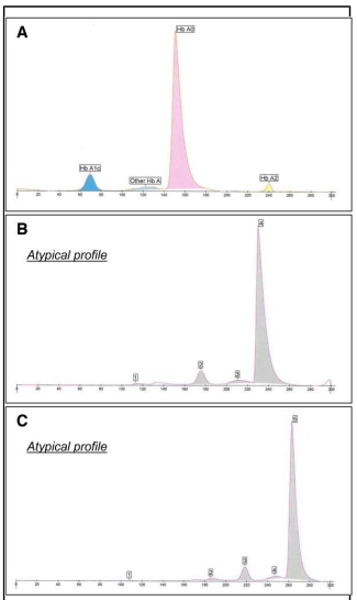 示例叙述 PART/1 一个有2型糖尿病病史的70岁老年男性,在门诊采血进行检验评价血糖水平和心血管疾病的风险。病人来到了实验室,没有明显的distress忧虑。HbA1c检测连同脂类失调的常规检测一起提供。脂类结果展现了混合型高脂血症,三油酸甘油酯升高、HDL胆固醇下降。毛细管电泳(CE)在Sebia CAPILIARY 3 TERA仪器上分析HbA1c的结果,出现了电泳图谱上非典型图形,没有报告HbA1c值。先前HbA1c检测在过去一年里的HbA1c结果≥6.5%,与他的T2DM诊断一致,揭示了在HbA1c浓度上有向下的表现(表1)。病人没有受到医学治疗或已知会影响红细胞或HbA1c检测的药物(1)。采用了不同的仪器、对病人另一个样品再次重复检测。结果还是如前一次标本的类似确不定的结果(表1)