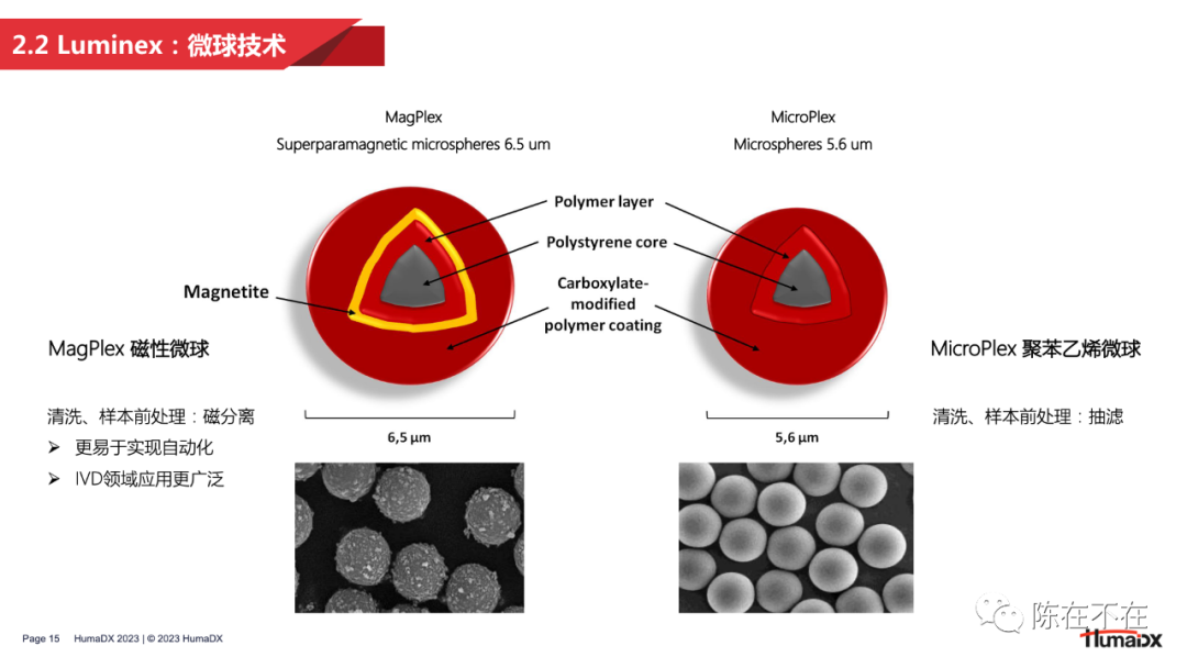 流式荧光技术的发明并非一蹴而就。从上世纪80年代开始,就有许多研究者对多重检测做出过探索。其中比较有代表性的例子包括将凝集检测和流式相结合的 PACIA 技术,以及加拿大学者在1993年做出的使用不同粒径微球进行多重检测的研究。  在商业端,DiaSorin、ABI 以及 BD 公司都曾对多重检测做出过探索。DiaSorin 将凝集法和流式技术结合,开发出了 Copalis 技术,仅通过前向散射光检测未凝集的单体微球的粒径,从而反算出待测物的含量,实现定性或半定量检测。 而在分子生物学领域大名鼎鼎的 ABI 公司则以类似拍照的原理,在90年代末期推出了名为 FMAT 的检测平台。但这一平台仅能对两种荧光染料染色的微球进行检测。 和 Copalis 一样,FMAT 也在应用有限、市场接受度低的原因下逐渐走向消亡。 有学者曾将90年代出现的多重检测技术进行了汇总,并从检测重数、试剂消耗量、仪器成本、清洗步骤、通量水平等多个维度进行了分析。 可以看出,至今仍然在科研和IVD领域应用的 CBA 和 xMAP 技术都在检测重数上具有明显优势。2 — 黎明:Luminex启幕流式荧光 接下来,将从团队组成、微球技术、产品信息及中国合作这几方面,对流式荧光技术开创者 Luminex 公司进行分析。 从 Luminex 的创始故事和团队可以看出,一家卓越的流式荧光企业应该具有 4 大能力拼图:材料学即微球研发能力、试剂研发能力、仪器开发能力,以及市场定位能力。这样的能力组合才能保证开发的产品既契合多重检测的技术特点,也满足市场实际应用需求。 微球方面,Luminex 最早推出的是 5.6µm 的 MicroPlex 聚苯乙烯微球,主要应用于科研领域。在IVD领域,出于样本前处理的需要,Luminex 接着推出了便于磁分离的 MagPlex 磁性微球。多重编码方面,Luminex 在最初的100重微球矩阵之外,通过增加荧光染料,将微球编码重数提高到了500重。不过500重编码的微球只能应用于 3D 和 Intelliflex 平台。
