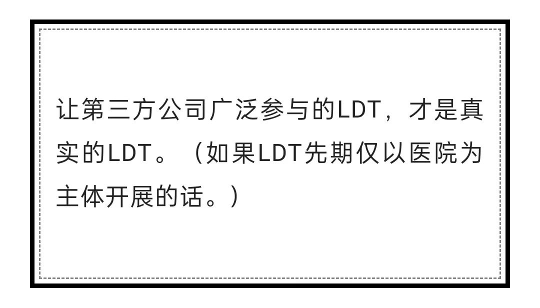 其中,对于“对国内尚无同品种产品上市,且有重大临床需求、技术成熟、全程风险可控的体外诊断试剂,开展LDT试点,建立试点机构管理、试点品种管理、退出机制等监管体系”的描述,与北京、上海LDT文件精神基本一致。 最大的不同,在于对“企业角色”的定位。 在北京、上海LDT文件描述中,企业的作用被极大弱化,仅作为“本地”“受托制备方”,承接试点医疗机构的试剂制备需求;只有医院试点,而无企业试点; 而在广州的历次文件关于LDT的描述中,企业的价值被重视和承认,明确支持LDT领域重点企业联合医疗机构开展LDT项目,并明确注有“试点企业”字样。(这或许与文件发文机构是发改委有关。) 咬文嚼字,一些积极信号值得玩味。 广州在LDT落地时,是否会跳出北京、上海的关于LDT政策的约束,给予企业更多的认可、赋予企业更多的空间,值得期待和关注。 这些都会在后续的具体实施文件中揭晓。 在北京、上海文件尚未发布前,我写到: 不想一语成谶。 北京、上海LDT文件,让很多业内公司感到难受。 本寄希望于LDT政策能让“不合规”的业务模式“合规化”,或“免于投入巨大、流程繁琐、耗时漫长、或看起来根本无法进行的IVD注册报批流程”,但这些幻想,在文件出来后,都最终幻灭。 更让企业难受的是,在新的政策文件中,企业的价值被弱化、合作区域被限制,如何支持、配合医院,如何共享收益,企业都在摸着石头过河,并无清晰路径可循。 这种政策不确定性,也意味着巨大的风险。 企业在LDT中的价值该被承认吗? 这不应该是一个疑问句,而是一个确定无疑的肯定句。 在这些新兴检测项目中,企业无疑扮演了主要的角色。技术的演进、产品的完善、市场的推广、售前中后服务体系,无一离不开企业的工作。企业是新技术、新项目的活力之源。 尽管行业发展过程中出现了诸多乱象,但将一切归咎于企业、剥离企业的做法,并不明智。 北京、上海LDT试点文件中的几个显著疑问: