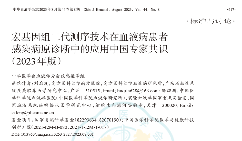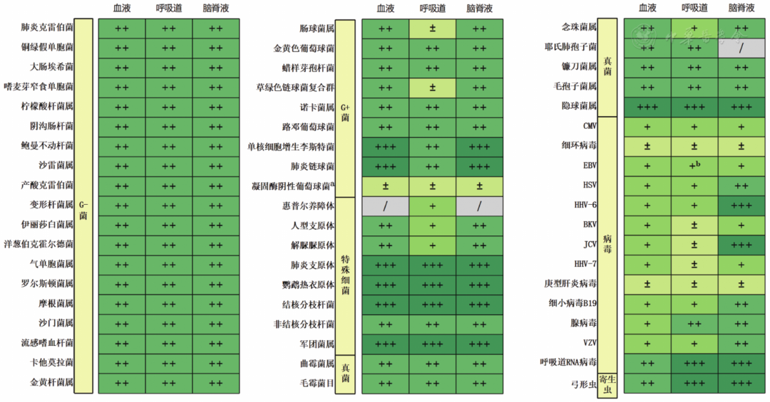 共识1:感染是血液病患者常见的并发症,当疑似感染发生时,应首先选择传统微生物学检测,仅在特殊情境下谨慎选择病原mNGS检测。 图1:血液病患者病原宏基因组二代测序(mNGS)送检流程图 1、中性粒细胞缺乏(粒缺)伴发热 共识2:低危且无明显感染灶的患者,如经验抗菌药物治疗≥7 d未明显好转可考虑在送检血培养的同时送检外周血标本mNGS;高危患者初始经验性治疗72~96 h无效时,推荐送检传统微生物学检测的同时送检血液mNGS。 2、血流感染(BSI) 共识3:疑似BSI患者,在留取血培养标本的同时留取血浆样本,于-80 ℃暂存;如72 h内血培养阴性且抗感染治疗无改善的患者,推荐将留存样本进行mNGS。疑似脓毒症的重症患者,建议送检血培养同时送检血mNGS。 3、下呼吸道感染 共识4:下呼吸道感染患者首选支气管肺泡灌洗液(BALF)送检传统微生物学检测,难以进行支气管肺泡灌洗的患者,可以选择深部痰进行检测,并同时留取标本冻存。如抗感染治疗≥72 h感染症状无好转或影像学表现持续加重的患者,建议送检留存标本行mNGS检测。如为重症下呼吸道感染或有快速进展为重症的危险因素患者,建议同时送检传统微生物学检测及mNGS。 4、中枢神经系统感染(CNSI) 共识5:疑似CNSI,推荐脑脊液在送检传统微生物学检测的同时送检mNGS,在流程上建议选择DNA检测,仅在考虑RNA病毒感染时完善RNA检测流程。 5、肠道或腹腔感染 共识6:疑似肠道感染患者推荐首选传统微生物学检测,粪便样本病原mNGS检测可作为补充。疑似腹腔感染,首选感染部位样本送检,如不能获得感染部位样本可选择血液样本送检,但检出性能有限,不作为常规推荐。 6、皮肤软组织感染 共识7:推荐对累及深部或播散性的皮肤软组织感染患者,在完善感染部位标本传统微生物学检测的同时送检mNGS,如不能获得感染灶局部样本,可选择外周血。 7、泌尿系统感染 共识8:对于复杂性泌尿系统感染、移植后泌尿系统感染在完善传统微生物学检测后不能获得病原学证据或治疗不佳的患者可尝试尿液mNGS。 共识9:对于病原mNGS检测样本,应首选从感染部位直接采集,若无法采集可考虑外周血标本送检。 推荐首选病变部位穿刺或手术采样,如不能获得该类样本,在选择邻近部位样本时应尽量减少正常菌群和定植菌的干扰。在样本采集后应尽快转运至实验室进行检测,以减少核酸降解。不同样本采集及注意事项见 表1 。多种感染类型血液中病原载量均低于感染部位样本,所以仅推荐血液作为替代样本送检。对于无明显感染灶、感染部位样本取材困难、经临床及实验室评估存在病原和(或)核酸入血的情况可进行血液mNGS。mNGS检测结果依赖于标本质量,标本采集与运输中应严格执行无菌操作与尽快转运原则。液体样本一般送检第二管以减少穿刺部位皮肤定植菌干扰。 表1:宏基因组二代测序(mNGS)感染标本送检类型及注意事项 报告解读 共识10:致病性明确且罕见定植的微生物,低序列检出也应考虑其为致病菌可能。 图2:不同微生物在血液病患者常见临床样本中检出的临床价值判断(注 /:该类感染未见报道或该病原罕见检出;±:定植或无明确致病意义;+:条件致病菌,可为感染病原同时也可存在无症状检出,建议结合临床与传统检测共同参考;++:条件致病菌,多数检出为感染病原;+++:检出应高度考虑是致病病原,传统微生物检测阴性不能除外感染。a多数凝固酶阴性葡萄球菌可为定植菌或背景菌,少数除外(如路邓葡萄球菌);b EBV引起的肺炎罕见,造血干细胞移植后EBV检出可与罕见的肺部淋巴组织增生性疾病有关) 共识11:无菌采集获得的样本检出病原,应结合临床考虑致病微生物的可能,但需注意排除定植。 对于外周血、组织、脑脊液、胸腹水及其他穿刺液等正常无菌样本,mNGS检出的细菌与真菌应结合当地感染流行病学、患者感染部位及定植情况考虑其是否为致病病原。样本中单一高序列细菌或真菌检出往往代表其是致病微生物可能性较高,而对于多种微生物检出,其解读应结合检出病原的常见定植部位及可能的微生物或其核酸的入血途径进行判断。例如,肠道或腹腔感染时,肠道黏膜屏障的破坏可引起多种肠道微生物(或其核酸)入血,血液mNGS可出现多种微生物检出的可能,一方面不能除外发生混合病原BSI,另一方面也可能仅为核酸入血。 共识12:外周血样本mNGS报告中DNA类病毒检出常见,并非均为感染病原。 共识13:非无菌样本的结果应结合临床、标本类型、传统微生物学检测结果共同判断。 共识14:耐药基因的检出,应在充分考虑基因型与耐药表型对应性的基础上进行判断。 不同细菌耐药基因与表型的一致性差异较大,部分耐药基因可存在携带而不表达的情况,如铜绿假单胞菌、阴沟肠杆菌染色体携带AmpC基因但其未必表达,AmpC基因检出不等同于耐药;而部分基因一旦检出则应高度考虑耐药的存在,如常见的碳青霉烯类耐药基因。常见耐药基因与表型一致性较高,且属于重点关注的耐药菌及其耐药基因包括:肠杆菌目细菌NDM、KPC基因-碳青霉烯类耐药,blaCTX-M基因-广谱头孢菌素耐药;金黄色葡萄球菌mecA基因-常见β内酰胺类耐药;鲍曼不动杆菌blaOXA-23基因-碳青霉烯耐药;屎肠球菌vanA或vanB基因-万古霉素耐药。 对于非无菌部位样本,如痰液、BALF等,多种微生物检出常见,其耐药基因的检出应考虑与病原的对应情况,例如mecA基因的检出可能出自金黄色葡萄球菌,但也可