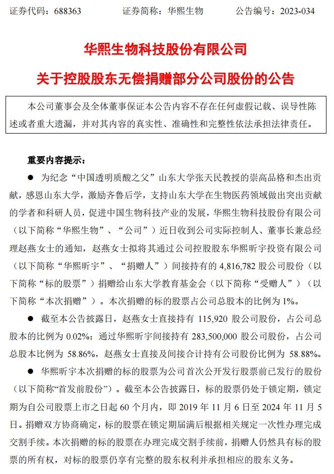 华熙生物董事长赵燕 公告表示,截至该公告披露日,标的股票仍处于锁定期,锁定期为自公司股票上市之日起60个月内,即2019年11月6日至2024年11月5日。捐赠双方协商确定,标的股票在锁定期届满后根据相关规定一次性办理完成交割手续。本次捐赠的标的股票在办理完成交割手续前,捐赠人仍然具有标的股票的所有权,对标的股票仍享有完整的股东权利并承担相应的股东义务。此外,截至该公告披露日,赵燕直接持有115920股公司股份,占公司总股本的比例为0.02%;通过华熙昕宇间接持有2.835亿股公司股份,占公司总股本比例为58.86%,赵燕直接及间接合计持有公司股份比例为58.88%。根据华熙生物官网资料,华熙生物成立于2000年,是全球知名的生物科技公司和生物材料公司。作为生物科技全产业链平台型企业,公司业务目前涵盖生物活性物原料、医疗终端产品、消费终端产品(功能性护肤品和功能性食品)。据华熙生物2023年半年报数据,华熙生物的净利润为4.22亿元,较去年同期同比减少9.71%。截至10月16日收盘,华熙生物的股价为83.12元,跌1.98%。若按照此价格计算,赵燕上述捐赠股份市值约4亿元,不过后续随着股价的变化,捐赠的股票市值相应也会发生变化。据官网资料介绍,山东大学是一所历史悠久、学科齐全、实力雄厚、特色鲜明的教育部直属重点综合性大学,在国内外具有重要影响,2017年顺利迈入世界一流大学建设高校(A类)行列。山东大学前身是1901年创办的山东大学堂,被誉为中国近代高等教育起源性大学。其医学学科起源于1864年,开启近代中国高等医学教育之先河。官网资料称,中国特色社会主义进入新时代以来,学校的整体实力和国际影响力明显增强,18个学科的学术影响力和贡献能力进入ESI世界排名前1%,5个学科进入ESI前1‰,金融数学、晶体材料、凝聚态物理、胶体界面化学、微生物、机械、材料学、心脑血管功能修复、新药制造、中国古典哲学等学科均达到国内一流水平,有些方向和领域已处在世界水平。