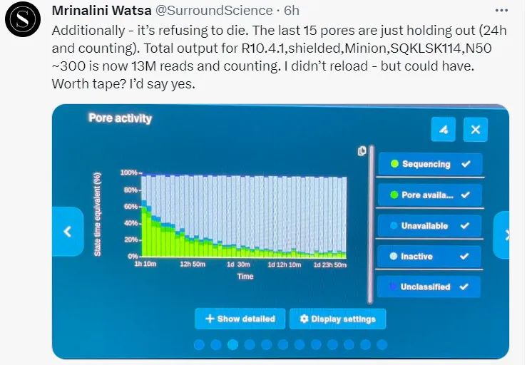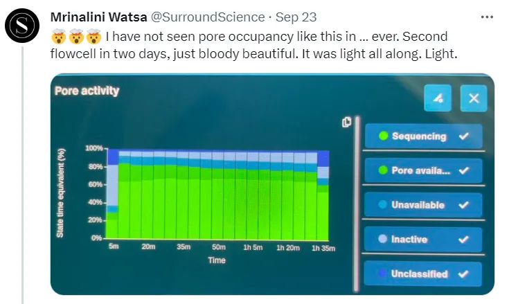虽然已经不热了,但发现国内没有其他媒体报道,还是来分享一下。 起因是ONT 在其社群网站上发布了有关新测序模式的更新,适用于其所有流通池系列。这种新模式下孔利用率提升,从而提高了测序运行的通量和数据产量。 这权且称之为“暗黑模式”。做法都很简单,把流通池测序区域遮上避光,一旦加载样品开始测序,用户可以盖上盖子或者用其他方式覆盖这个区域。 这不是什么新奇的技术更新,只是通过遮避光来避免纳米孔测序体系在测序运行中受到影响。(所以,如题,不是标题党。) ONT提示,特别是应用的 MinION 流通池上的较短读取时,产量提**469%,而对于其他不同的测序组合也都有10%到150%的提升。 ONT在其官方社群内提供了全面的说明,非ONT用户可能看不到。社群也是ONT引以为豪的地方,不管是ONT还是其用户经常会在这里分享一些技术更新、操作改进或其他创新的尝试。 这个对话,hhh... “暗黑”模式一发布,大家就迫不及待地上手测试和验证。很多客户使用了自创的“暗黑”手段,来评估这对通量和孔寿命的影响。 如果“暗黑”真的能提升数据产量、延长孔的使用,客户一定是拍手叫好的。 “暗黑”在客户手里也出现了“奇迹”……当然,也有更多的“创新”。 光子撞击孔所在的膜,会影响孔本身的寿命和可用性。 于是就有人在问,如果减少光子的影响可以提高测序运行的质量,那么下一步是什么?是不是应该考虑地球上的不同辐射源对于纳米孔测序的影响? 除了筛选新的更快速兼顾更准确的马达蛋白之外,ONT在LC23上已经提到了缓冲液成分的迭代改进可以减少孔的阻滞及DNA相互之间的作用,进而提升产量(30%以上)。 每个PromethION流通池已经能稳定产出100G以上的Q20+数据,实现690美元的30xWHG。客户手中实现的记录是196Gb(R10.4.1,今年LC23上提到),ONT内部通过在开发的快速马达蛋白声称已经实现了>350Gb的最大产出。 如果每个流通池产量达到400Gb,ONT有可能实现200美元的长读长基因组。那会是在什么时候? 看来,“暗黑”只是个开胃小菜,这还远远不够,是需要系统地去探索一下还有哪些因素可能影响测序运行的质量、产量和持续时间。 想必这些应该都已经在ONT的日程上了。 |