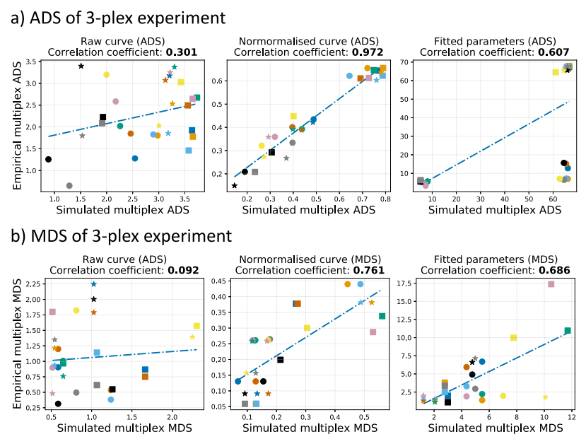 对每个引物组进行湿实验室测试,并将原始数据合并为27个模拟多重检测。一组扩增曲线,可以被认为是多维空间中的数据点。所有曲线中位数之间的距离被用来生成所有可能组合的平均距离评分(ADS)和最小距离评分(MDS)。下图直观地表示了ADS和MDS的计算机模拟测试和湿实验室测试之间的相关性。在ADS和MDS中,归一化曲线相关性得分高于其他曲线。这些结果强调了作者的评分系统(基于ADS和MDS)的可用性。