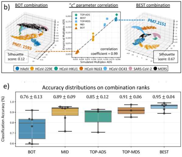 接下来,作者尝试利用Smart-Plexer开发一种最佳的7-plex检测方法,能够使用qdPCR在单个荧光通道中准确识别以下呼吸道感染(RTI)病原体:人类腺病毒(HAdV)、人类冠状病毒OC43 (HCoV-OC43)、人类冠状病毒HKU1 (HCoV-HKU1)、人类冠状病毒229E (HCoV-229E)、人类冠状病毒NL63 (HCoV-NL63)、中东呼吸综合征相关冠状病毒(MERS-CoV)和严重急性呼吸综合征冠状病毒2 (SARS-CoV-2)。为每个靶标设计了至少两种不同的检测方法,七种病原体共有24种单一检测方法。每个引物组用其相应致病靶点的合成DNA进行检测。对得到的原始曲线进行处理、拟合并传递给Smart-Plexer以计算所有可能的7-plex组合(N = 4608)并计算其ADS/MDS。作者将二维空间中可视化ADS和MDS分为五类,用qdPCR方法进行实证检验:BOT (N = 6)、MID (N = 6)、BEST (N = 6)、TOP-ADS和TOP-MDS (N = 6)。结果表明,计算机模拟与实验检测结果相关系数为0.99(下图b)。此外,与BOT相比,BEST组合在聚类方面表现出明显的分离(与3-plex结果一致),性能显著高于BOT组合,准确率提高了39.42%。