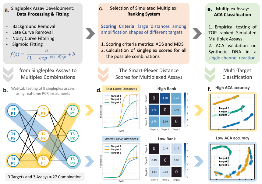作者开发了Smart-Plexer,这是一种使用单路PCR反应为基础来生成最优多重检测的框架。在定义靶标数量并上传实时PCR单路检测数据集后,Smart-Plexer将结合来自每个靶标的扩增曲线数据,模拟多重检测(如下图)。将Smart-Plexer与扩增曲线分析(ACA)方法进行了耦合和评估,通过扩增曲线中的动力学信息,ACA可以有效识别反应中的不同靶标。