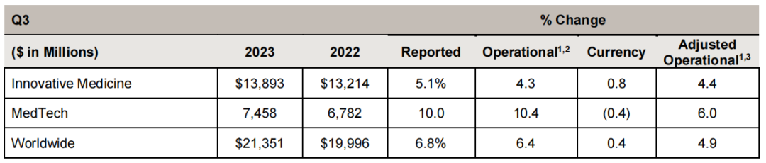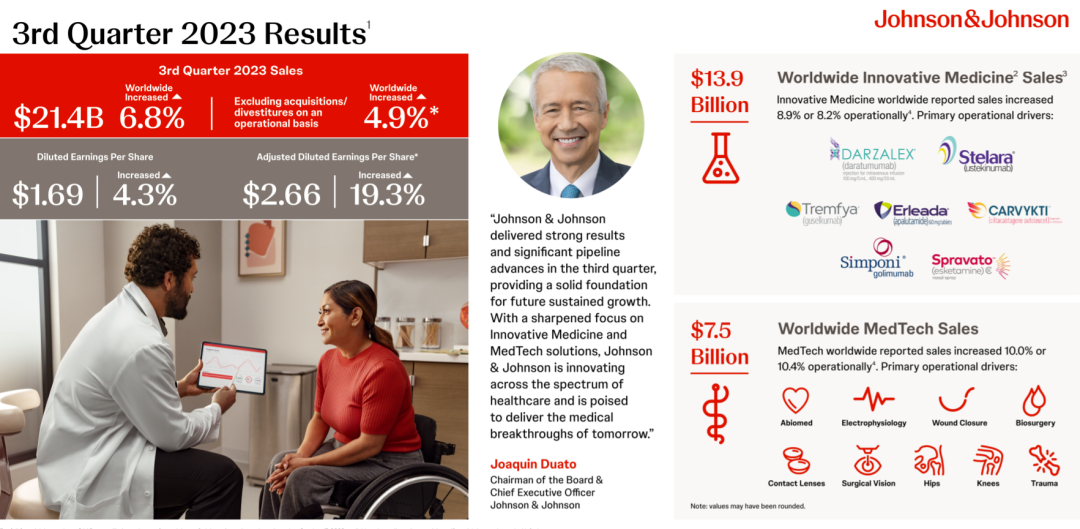 10月17日,强生公布了最新2023年第三季度业绩。此外,由于公司制药和医疗设备业务的销售额大幅增长,其上调了全年预期。 数据显示,强生Q3营收213.5亿美元,同比增长6.8%,高于预期的210.4亿美元。净利润43.1亿美元(持平)。展望未来,强生上调了全年业绩指引,预计2023年全年销售额为836亿至840亿美元,此前预期为832亿至840亿美元。 增长是由治疗多发性骨髓瘤的生物制剂Darzalex、前列腺癌症治疗药物Erleda和其他肿瘤治疗药物的销售所驱动。另外,用于治疗多种免疫介导的炎症性疾病的重磅药物Stelara也促进了这一增长。不过,今年晚些时候,强生将失去对Stelara的专利保护。此外,与传奇生物合作的BCMA CAR-T疗法Carvykti1-9月合计销售额3.41亿美元(约25亿元人民币)。其预计今年销售额将突破5亿美元,明年有望突破10亿美元。医疗设备业务营收近74.6亿美元,同比增长10%。强生表示,增长主要来自电生理产品,去年12月对人工心脏厂商Abiomed的收购后该业务驱动了增长。此外,骨科业务营收21.64亿美元(+3.4%);眼科业务营收12.56亿美元(+4.2%)据悉,这是强生8月完成与消费者健康子公司Kenvue的分拆的首份季度业绩。分拆后,强生曾一度下调了全年销售和利润指引。然而,尽管强生第三季度业绩优异,但投资者仍对该公司面临的数千起诉讼感到焦虑,这些诉讼声称强生的滑石粉产品被致癌物石棉污染。虽然这些产品,包括强生同名的婴儿爽身粉,现在都归Kenvue所有,但强生将承担在美国和加拿大产生的所有与滑石粉相关的责任。据悉,2021年强生将滑石粉索赔权转移到了一家新的子公司LTL Management,并立即申请了破产保护。但在今年7月份,一名联邦破产法官驳回了强生第二次试图以破产方式解决这些诉讼的请求。强生此前表示,LTL Management打算对该决定提起上诉。财报公布后,截至发稿,强生盘前涨1.54%。今年迄今为止,强生股价累计下跌近11%,当前市值约为3790亿美元。