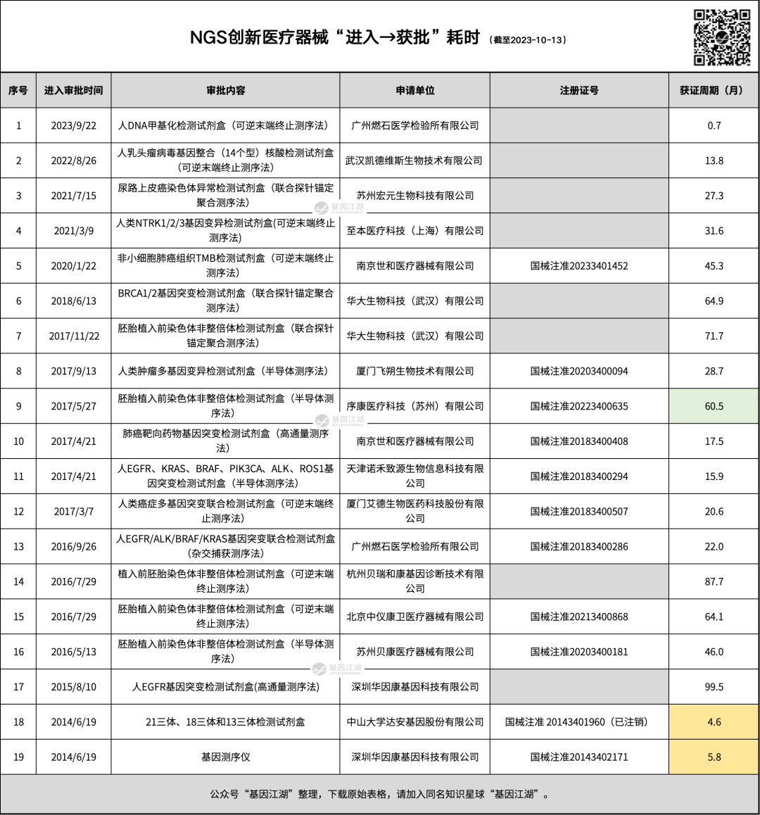 对于一家企业而言,打上“创新”标签的重要性不言而喻。 8家NGS企业获批9款“创新产品”,还有数款正在申报途中,为什么大家仍在泥泞挣扎? 很少有人注意到,国家开展“创新医疗器械审批”颁发的第一证,正是NGS项目: 来自深圳一家老牌测序仪厂商:深圳华因康。 但很多行业新人,对这家企业并不熟悉,没见过其产品,甚至没听过这家企业。 援引自朋友“陈在不在“的说法, “拿证只是产品商业化第一步,其后是收费,医保,是为三重门。” 深以为然。 无论是走的创新通道,还是按部就班的普通路径,获证只是完成了万里长征的一小步;支付问题、真实的临床价值都需要在更具体、更真实的情境下去逐步印证。 甚至,在笔者看来,“获证”可能是多种因素的共同作用,并非完全意义上遵从于严格的“注册审批流程”,这里可能有产业扶持、政策倾斜、创新探索等多种因素。 例,在创新审批刚发起阶段,前两款NGS产品:华因康的基因测序仪、达安基因的NIPT检测试剂,从进入创新到最终获批,耗时不到半年: *绿色颜色标注为特殊标注,并非通过创新路径获批。 尾声 上午写这篇文章时,刚好见到燃石的推文: