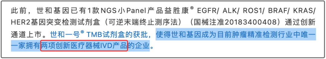 除了在“多癌种早期检测产品”上争个NMPA创新审评通道的“唯一”,如顺利获批,也会打破世和基因所标榜的“肿瘤精准检测行业唯一一家拥有两项创新医疗器械IVD产品的企业”。
