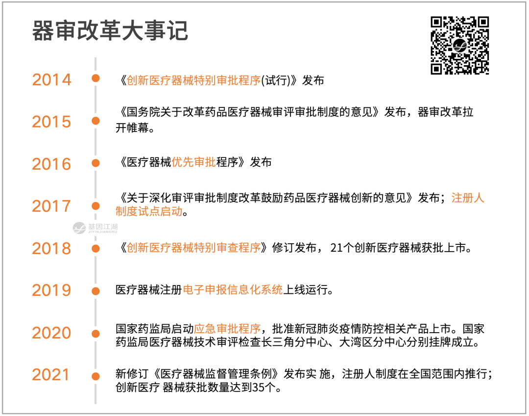 进入“进入创新医疗器械特别审查程序”指什么?进入有什么好处?进入了就一定会获批吗? 除了最近世和、燃石的例子,还有哪些NGS企业进入了创新审查?哪些最终获批上市?而又有哪些无果而终? 历史是成功者的宣言,但失败者的教训往往更为深刻。 NGS创新医疗器械之路,记录着华大、贝瑞、诺禾、燃石、世和、艾德、至本等十余家NGS企业的名字,和他们各自不为人知的故事。 一条创新“捷径” 时间回溯至2014年,原CFDA发布了《创新医疗器械特别审批程序(试行)》,为创新医疗器械设置特别审批通道。 2018年,试行文件修订为《创新医疗器械特别审查程序》,器审中心为此单独设立创新审查办公室,让创新产品“单独排队,一路快跑”。