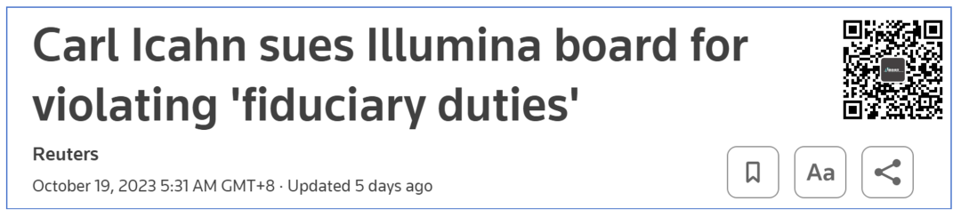 美国的上市公司,很多都没有实际控制人。 那么,在这种局面下如何保护股东的利益呢? 答案是很多时候要仰赖董事会。 比如说,SEC(美国证券交易委员会)和交易所等机构颁布了许多治理准则,要求上市公司遵循一定的规则和最佳实践。 这些准则包括透明度原则、独立审计和薪酬委员会等,旨在确保公司管理层和董事会的行为符合法律和道德要求。 但是,往往有管理层能够打通跟董事会的关系,越过道德与法律的边界。 这个时候,会引出两个反制措施,逐级递进。 第一,通过召开股东大会更换董事会,重新制衡公司管理层。 第二,对管理层或(和)董事会提起诉讼。 之前Icahn跟Illumina管理层的战争就是第一条的鲜活示例。 我们此前花了很多篇幅来梳理华尔街之狼Carl Icahn与Illumina管理层之间的战争,而这场战争主要的矛盾点又是在GRAIL。 这两天,Carl Icahn又爆出猛料,他起诉了Illumina原董事长/CEO和管理层! 想要了解详情,我们先要简单做下回顾。 战情回顾 你们,都有罪! 最后-帝国的余辉 |