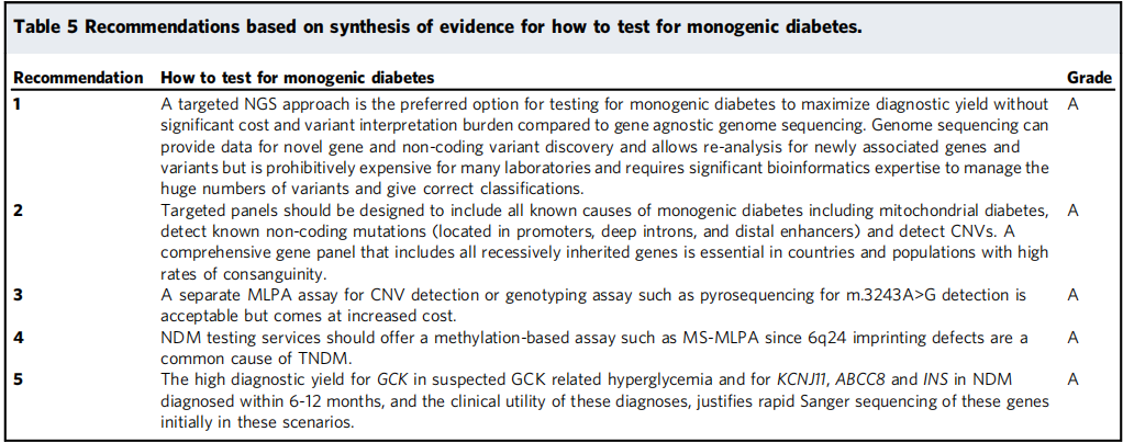 一些糖尿病类型,称为单基因糖尿病,是由单个基因的变化引起的。单基因糖尿病目前有40多种不同的遗传亚型,其中一些亚型可进行精准治疗,例如,磺脲类药物用于治疗KATP新生儿糖尿病、HNF1A 和HNF4A糖尿病。任何给定的单基因糖尿病亚型的遗传诊断都可以提供精确的预后,如EIF2AK3的肝功能障碍和骨骼发育不良或WFS1的听力和视力丧失。此外,可以为亲属提供测试,以确定他们是否有风险。诊断单基因糖尿病需要进行基因检测,但费用昂贵,因此不可能对每个糖尿病患者进行检测。 糖尿病精准医学倡议(PMDI)于2018年由美国糖尿病协会(ADA)与欧洲糖尿病研究协会(EASD)合作建立,致力于通过精准医学解决对更好的糖尿病预防和护理的日益增长的需求。近日,杂志COMMUNICATIONS MEDICINE上发表了一篇题为“The use of precision diagnostics for monogenic diabetes: a systematic review and expert opinion”的综述文章。本系统综述是代表ADA/EASD PMDI撰写,作为支持第二届国际精准糖尿病医学共识报告的综合证据评估的一部分。作者评估了已发表研究关于谁应该接受检测以及使用何种检测。在此基础上,研究团队就如何实施单基因糖尿病的基因检测为医生和卫生保健提供者提供建议。最后,作者确定了该领域的主要挑战,并强调了未来研究和投资的领域,以支持更广泛地实施单基因糖尿病的精准诊断。 图片来源:Communications medicine 主要内容 谁应该检测单基因糖尿病? 对于谁应该检测单基因糖尿病的问题,作者筛选了10,469篇出版物并纳入了100篇出版物。原综述中详细列出了纳入研究的证据摘要,感兴趣的童鞋可自行查阅。研究团队基于这些证据提供了建议如下: (1)所有6个月前诊断为糖尿病的患者都应使用基因大panel检测单基因形式的新生儿糖尿病---Grade A; 所有在6 - 12个月被诊断的患者都应使用基因大panel单基因形式的新生儿糖尿病;在12-24个月诊断为糖尿病的患者中,没有明显的单基因病因支持基因检测---Grade B. (2)妊娠期糖尿病且空腹血糖高于5.5 mmol/L且无肥胖的妇女应检查GCK病因---Grade B. (3)在没有肥胖的情况下,任何年龄持续轻度高血糖(HbA1c 38-62 mmol/mol,或空腹血糖5.5-7.8 mmol/L)的患者应进行GCK病因检测---Grade A. (4)30岁以下无肥胖症,如果自身抗体阴性和/或C肽水平保持不变,应使用大型基因panel进行单基因糖尿病检测---Grade A. 基于综合证据的建议。 图片来源:Communications medicine 如何检测单基因糖尿病? 研究团队从筛选的2102篇出版物中纳入了32项研究,共涉及76个不同基因的研究。基于对文献的系统回顾,作者提出了几点建议(如下表): (1)与基因组测序相比,靶向NGS方法是单基因糖尿病检测的首选方法,可以最大限度地提高诊断率,而无需承担重大成本和变异解读。基因组测序可以为新基因和非编码突变的发现提供数据,并允许对新相关基因和变异进行重新分析,但对许多实验室来说过于昂贵,并且需要大量的生物信息学专业知识来处理大量的变异并给出正确的分类。---Grade A. (2)靶panel的设计应包括所有已知的单基因糖尿病原因,包括线粒体糖尿病,检测已知的非编码突变(位于启动子、内含子和远端增强子),并检测CNVs。在具有高血缘关系的国家和人群中,一个包括所有隐性遗传基因的综合基因panel是必不可少的。---Grade A (3)单独的MLPA检测CNV,或基因分型分析如焦磷酸测序检测m.3243A>G是可以接受的,但成本会增加。---Grade A (4)NDM检测服务应该提供基于甲基化的分析,如MS-MLPA,因为6q24imprinting缺陷是TNDM的常见原因。---Grade A (5)GCK在疑似GCK相关高血糖中的高诊断率,以及在6-12个月内KCNJ11、ABCC8和INS在NDM中的高诊断率,以及这些诊断的临床应用,证明了在这些情况下最初对这些基因进行快速Sanger测序是合理的。---Grade A 关于如何检测单基因糖尿病的综合证据的建议。 图片来源:Communications medicine 将一个基因视为单基因糖尿病病因的依据是什么? ClinGen制定了一个评估基因疾病有效性的一般循证框架,该框架包括评估病例级别、和先前报告的变异的功能数据以及基因本身的功能数据,将基因-疾病有效性关系分为确定、强、中等、有限、有争议或驳斥的类别,并结合专家共识进行最终分配。国际MDEP GCEP的目标是管理单基因糖尿病基因的基因-疾病有效性,并正在努力扩展到这些基因之外。对于单基因糖尿病,可以在如下网站上找到一份单基因糖尿病基因列表(https://www.diabetesgenes.org/)。 作者意见是,一个基因只有在符合专家制定的用于验证基因-疾病关系的指南中规定的标准时才应被认为是单基因糖尿病的病因。这些指南已经被ClinGen MDEP GCEP应用于许多单基因糖尿病基因。建议继续通过MDEP GCEP集中研究新的以及更新现有单基因糖尿病基因的基因-疾病有效性。 在什么基础上一个变异应该被认为是单基因糖尿病的原因? 2015年,ACMG和AMP制定了序列变异解读的通用指南。这些指南经过了几次更新。ClinGen的MDEP VCEP对三种常见的单基因糖尿病基因(HNF1A、HNF4A和GCK)的通用指南进行了修改;这些指南解释了单基因糖尿病变异解读的许多问题,并且可以用作解读尚未建立规则的基因变异的框架。 ACMG/AMP指南是通过一个以证据为基础的过程制定的,结合了各种类型的证据来确定一个变异是致病的、可能致病的、不确定意义(VUS)的、可能是良性的或者是良性的。证据类型的例子包括:gnomAD等公共数据库中的频率;分离:具有疾病表型的