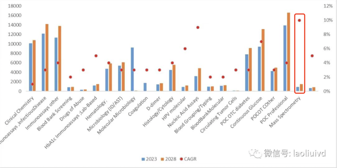 Kalorama information 最新发布的全球IVD报告里指出,在所有的细分领域中,最看好临床质谱仪发展,增速预估超10%(最高),主要得益于质谱的自动化技术的推进。