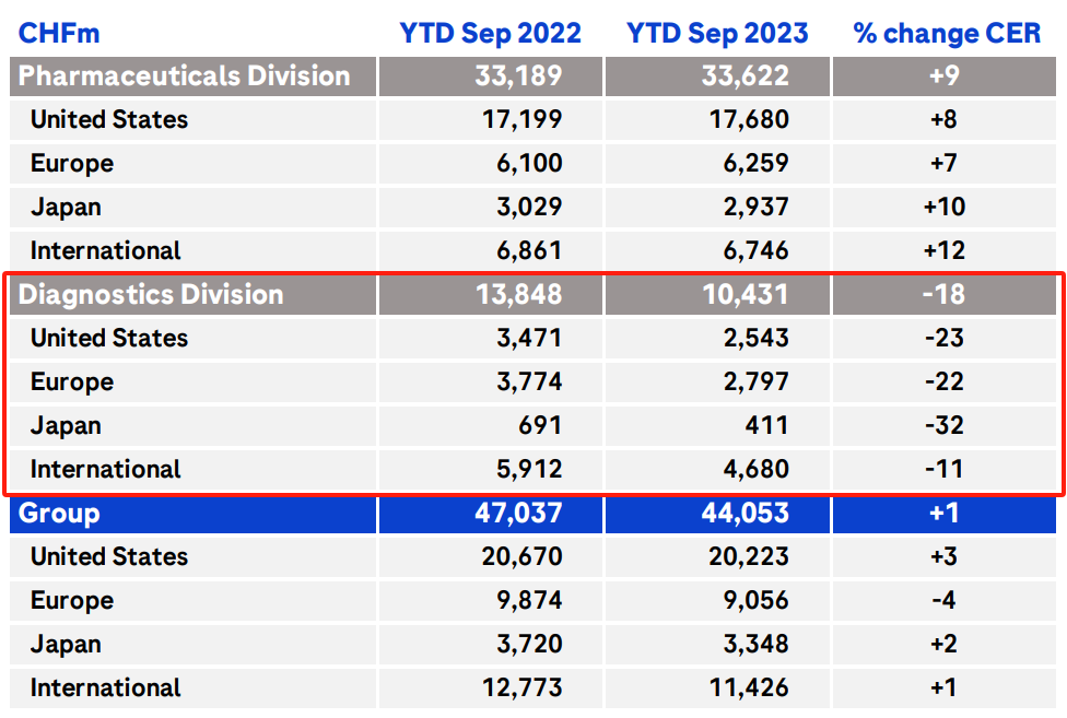 罗氏:诊断业务营收第一(33.33亿瑞士法郎),同比-5%,剔除新冠业务后同比+7%,与前两个季度的-28%和-17%相比,已基本走出新冠业务下滑的影响。
