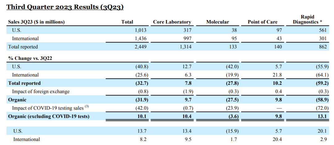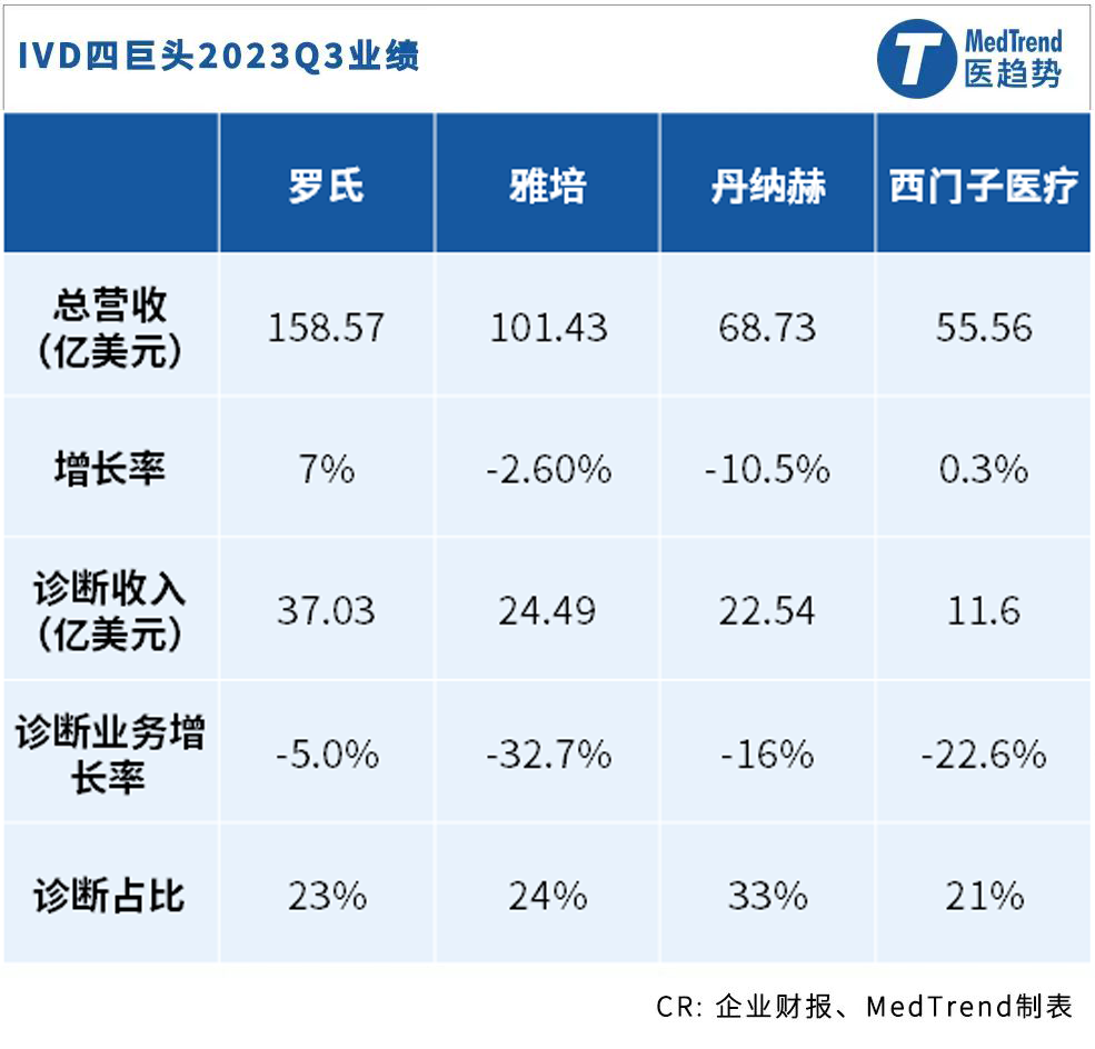 站得高,才跌得重。昔日的新冠检测“明星”对这句话体会最为深刻。截至10月24日,IVD四大公司2023第三季度财报全部出炉。随着疫情的翻篇,在四大公司诊断收入中,新冠业务的占比越来越小,因此今年Q3的业绩回归真正实力的比拼。四大公司诊断业务排名依旧,罗氏第一,雅培第二,丹纳赫第三,西门子医疗第四。
