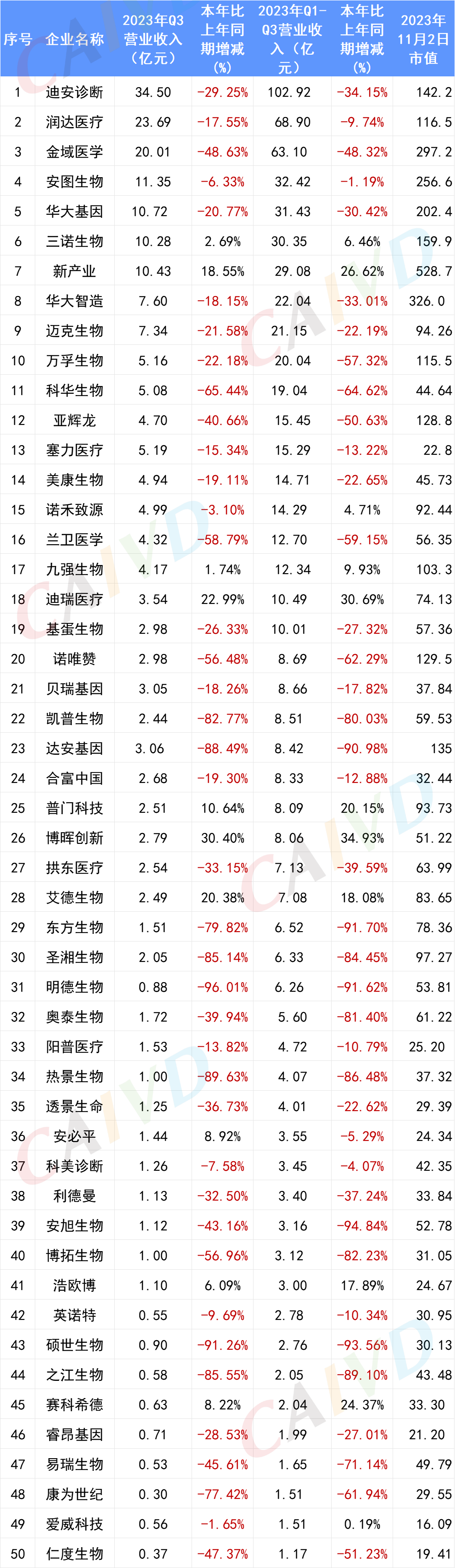 截止2023年10月31日,已有50家IVD上市企业公布了其Q3的财报,从已公布的数据来看,前三季度总营收前十的企业分别为:迪安诊断营收102.92亿元、润达医疗营收68.90亿元、金域医学营收63.10亿元、安图生物营收32.42亿元、华大基因营收31.43亿元、三诺生物营收30.35亿元、新产业营收29.08亿元、华大智造营收22.04亿元、迈克生物营收21.15亿元、万孚生物营收20.04亿元。 前三季度总营收表: 按总营收排名(滑动浏览) 从整体Q3财报数据来看,只有11家企业(22%)的前三季度总营收相较于去年同期增长为正,分别为:博晖创新总营收8.06亿元,同比增加34.93%,迪瑞医疗总营收10.49亿元,同比增加30.69%,新产业总营收29.08亿元,同比增加26.62%,赛科希德总营收2.04亿元,同比增加24.37%,普门科技总营收8.09亿元,同比增加20.15%,艾德生物总营收7.08亿元,同比增加18.08%,浩欧博总营收3.00亿元,同比增加17.89%,九强生物总营收12.34亿元,同比增加9.93%,三诺生物总营收30.35亿元,同比增加6.46%,爱威科技总营收1.51亿元,同比增加0.19%。 前三季度营收表: 按增长率排名 博晖创新、迪瑞医疗、新产业、赛科希德、普门科技、九强生物、诺禾致源、爱威科技无论是前三季度的总营收还是归母净利润都实现了同比正向增长。安图生物、美康生物、阳普医疗、科美诊断虽然营收比去年同期有所下降,但是净利润却实现了正增长。艾德生物、浩欧博、三诺生物前三季度营收实现同比正增长,但是总利润却相较去年同期有所下降。 总利润表 利润表:按利润增长率排名 与体外诊断相关的上市企业前三季度营收情况如下:迈瑞医疗273.04亿元,归母净利润98.34亿元,万泰生物49.69亿元,归母净利润18.08亿元,中源协和12.02亿元,归母净利润1.33亿元,丽珠集团96.55亿元,归母净利润16.02亿元,理邦仪器23.37亿元,归母净利润3.39亿元,天瑞仪器6.16亿元,归母净利润-0.14亿元。 总表(按总营收排序) 注:诺辉健康、艾迪康、巨星医疗、华检医疗、康圣环球、云康集团、中生北控、美因基因、华康生物医学未公布其三季度财报。 供稿、编辑:雪墨 | 校对:甜宝 | 责编:小舟 |