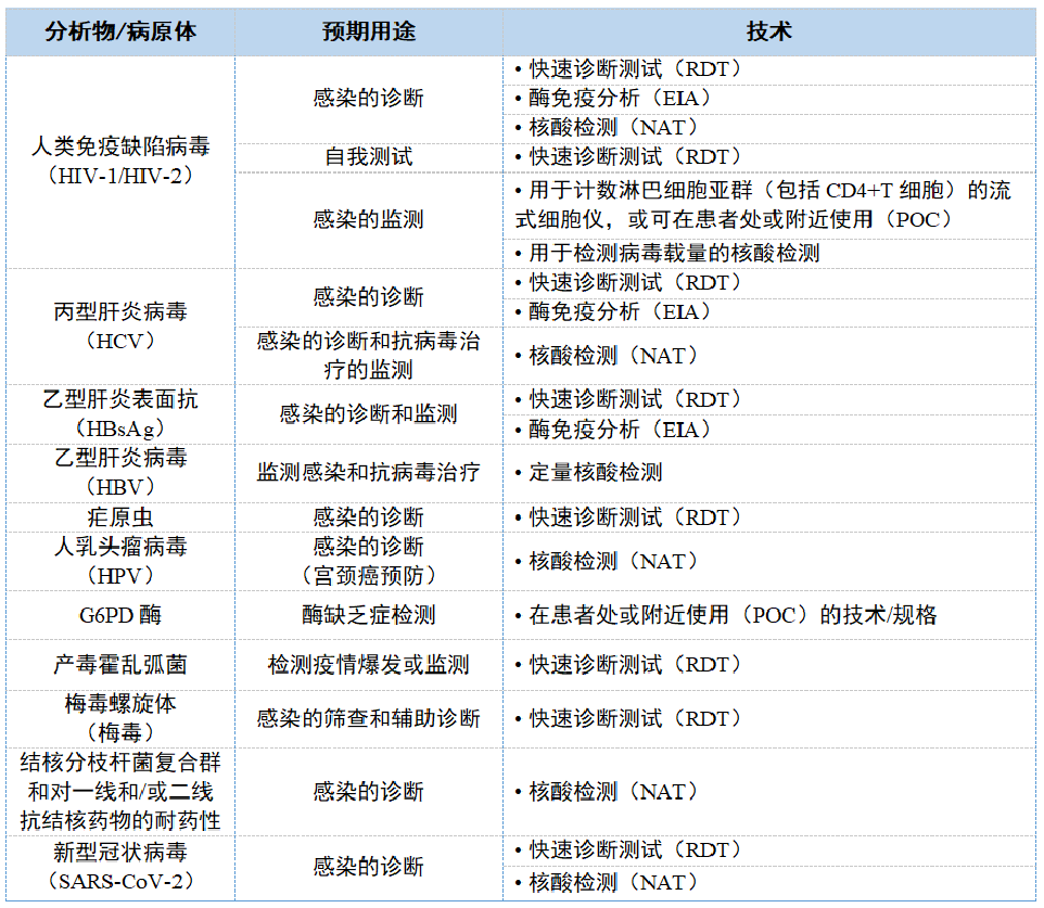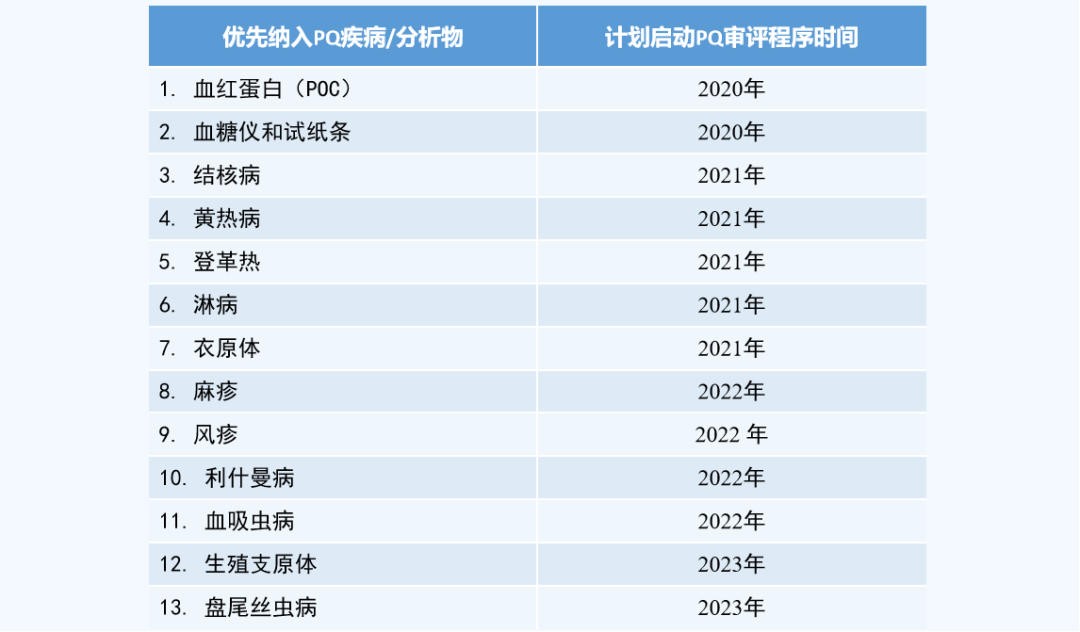通过这个表格可以看出,WHO PQ重点纳入了感染和肿瘤相关的病原检测,包括艾滋、疟疾、肝炎、结核病、梅毒、霍乱、HPV等,技术上更侧重快速诊断测试(RDT)。 这与WHO PQ着力于为医疗资源欠缺地区的高负担疾病,提供产品选择有关。一方面这些欠发达国家的上述疾病负担较高,人群诊断和治疗的需求很大;另一方面其医疗产品监管机制也不够健全、完善。 基于这些问题和需求,WHO 设立了PQ IVD审评机制,自2010年运行以来已使多方获益,包括世卫成员国、NGO组织、监管机构、IVD生产企业和合作评估实验室。 小编从数量统计中发现,截至2023年6月7日,WHO PQ一共批准了110个IVD产品。排名前三分别是艾滋病、疟疾和丙型肝炎病毒HCV。目前正在PQ审评的产品队列中,排名第一、第二仍然是艾滋病和疟疾,HPV排名上升,和HCV并列第三。 近几年随着宫颈癌筛查指南不断更新,HPV检测项目关注度不断攀升,小编看到正在PQ审评中的HPV产品有4款,均来自跨国IVD企业,期待未来看到国内企业的HPV产品进入WHO PQ清单中,在国际市场上拥有一席之位。 值得一提的是,响应采购机构、成员国等相关方需求,随着时间推移WHO一直在持续扩大IVD产品的PQ审评范围。2020年1月WHO公布了计划未来3年优先纳入IVD PQ审评管道中的分析物/疾病: 该计划发布后,新冠疫情接踵而至,严重推迟了这些项目的既定时间规划。这13个品类中,仅有结核在去年9月开放了PQ审评程序,比原计划推迟约1年。今年5月WHO宣布新冠不再构成国际关注的突发公共卫生事件(PHEIC),小编推测原定计划中的这些项目会恢复正常进度甚至加快进度。 另外小编从WHO网站了解到,当前血红蛋白检测和血糖监测正在制定相关技术规范文件,距离开放PQ审评的节点已非常接近。拥有结核核酸检测类、血红蛋白POC以及血糖监测类产品的IVD企业,不妨现在规划布局,争取约1-2年后成为该品类第一个卷到WHO的中国企业。 至于1-2年需要经过哪些审评步骤,由于国内进入WHO EUL或者WHO PQ的IVD产品较少,大部分企业可能了解较少,敬请关注本系列第二篇 “ WHO PQ的IVD审评流程是什么?” 同泽合信(北京)医药科技有限公司作为科技部认定的“国家高新技术企业”,是一家专注于体外诊断(IVD)领域的法规咨询与临床技术服务合同研究组织(CRO)。我们致力于通过解决注册战略规划、重大项目实施等最关键的问题,帮助客户实现上市前阶段的实质性突破,获得长远的市场发展。 公司始终坚持“信用与服务第一”,在监管政策咨询、注册申报、型式检验、研发设计优化、临床试验、临床核查、质量体系建立、模拟检查、法规培训等全产业链上的各个关键节点提供完整解决方案,鼎力为国内外客户提供高效率、高品质的专业化服务。 |