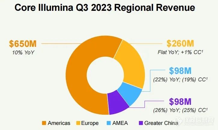 2023年第三季度收入11.2亿美元,同比增长0.36%,非GAAP利润率为66%;第三季度核心收入(不包括GRAIL)11.06亿美元,同比下降0.36%。2023财年第三季度非GAAP净利润5200万美元,同比下降3.7%,GAAP会计准则下亏损达7.45亿美元,包括GRAIL相关的8.21亿美元的无形减值。 2023财年前三季度累计收入33.82亿美元,去年同期累计收入为35.01亿美元,同比下降3.4%。前三季度核心收入(不包括GRAIL)33.41亿美元,同比下降4.19%。(财报特别说明,报告中数据主要是非GAAP业绩,替代或优于按照公认会计准则计算的财务指标。因为在gaap下的财务指标包括大量费用,如收购的无形资产的摊销等。) 分业务看,第三季度: