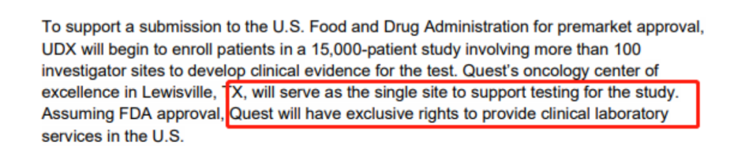 | 自2014年Cologuard重磅推出以后,便成了结直肠癌早筛领域里最高的山,最长的河,对标Cologuard已成习惯,彷佛不跨过它便无法证明自己。而Cologuard的表现也无愧于它的地位,在我们16号的文章《现在美国癌症检测哪个最火?多家企业Q3财报内藏玄机》中,便着重介绍了Cologuard持续走高的业绩。截至9月30日,检测量已经累积达到1,300万人次,并且增长的势头也不见放缓。与之相对,Exact Sciences的今年Q3营业额达到6.28亿美元。  当然人家Exact Science独坐山巅也没想着坐吃山空,一直关注着试图挑战自己地位的后辈们,就在11月17号Exact Sciences起诉Geneoscopy专利侵权,真侵权了吗?管他呢,告了再说。可怜Geneoscopy刚刚拿下Labcorp的分销协议,还没高兴两天就又要焦头烂额。Exact Sciences和Geneoscopy正打的热火朝天,这边Quest也没闲着:Universal DX,这7,000万你先拿着,咱们也掺和一脚。UDX:我现在只做血检和LDT,你应该不会也来起诉我吧?抛开Geneoscopy先不谈,UDX这是怎么个事呢?11月21号,Quest发文,将用7,000万买断UDX旗下Signal-C测试在美国的版权,临床也只许在Quest位于德州的临床点做。Quest也确确实实有当霸总的资历,除去遍布全美2,100个服务中心,迄今已为1/3的美国公民和过半的医生和医院提供服务,这渠道谁看了不得擦擦口水。UDX是一家于2012年在西班牙成立的生物技术公司,总部位于马德里(西班牙),在斯洛文尼亚和麻省皆有布局。旗下的Signal-C®通过识别血液中循环结直肠癌肿瘤细胞释放的甲基化DNA片段以进行结直肠癌的早期筛查。在2023年5月的消化疾病周会议上,UDX公布了一项入组约1,000名患者的研究结果,Signal-C®在结直肠癌检测的敏感性达到了93%,以及在92%的特异性条件下,对于早期腺瘤的检测达到了54%的敏感性。本来UDX跟美国市场基本是不沾边的,但耐不住美国市场过于香甜可口,与Geneoscopy和Labcorp的协议类似,如果成功拿到了PMA,Quest将成为其在美国的唯一经销商。要想马儿跑,不能让马儿不吃草,与之对应的,我们的霸总Quest要支付给UDX 7,000万美金,毕竟临床这么烧钱,不给点好处很难让UDX坚定进军美国市场的决心。拿到钱的UDX容光焕发,当即决定就跟Quest走了。为了跨过FDA这道坎,UDX计划在全美的一百多个临床点招募超过15,000名患者入组,魄力,拿出来了,诚意,也摆在这里。话说Cologuard拿证时候做的临床规模是多大来着?在2012年11月,Cologuard的第一批临床数据来源DeeP-C研究,从美国和加拿大的 90 个临床站点招募了共计招募超过 12,700 名受试者进行试验。当然Exact Science也不是吃素的,这么多年除了混的不太如意已被收购的Epi Genomics,倒也没有谁能实实在在的威胁到它的地位。或许这段时间很流行一句话用来形容它很合适:All roads lead to me.血检出身的UDX或许还算不上是Exact Science严阵以待的竞争对手,但再加上Quest助力,Exact Science也很难忽视,毕竟大家都知道LDT只是为拿证作过渡。UDX总有一天会成长到值得重视的地步。届时,UDX站在Exact Science面前,起诉侵权这条路走不通的Exact Science又该如何应对?层出不穷的挑战者,到底谁能够真正撼动Exact Science的霸主地位?