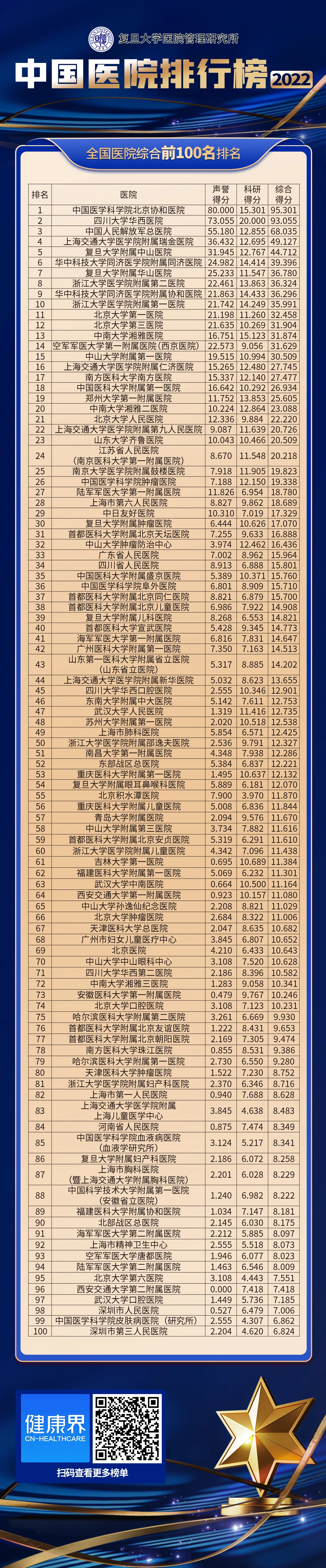 在2022年度全国医院综合排行榜上,列前10位的医院依次分别是:中国医学科学院北京协和医院、四川大学华西医院、中国人民解放军总医院、上海交通大学医学院附属瑞金医院、复旦大学附属中山医院、华中科技大学同济医学院附属同济医院、复旦大学附属华山医院、浙江大学医学院附属第二医院、华中科技大学同济医学院附属协和医院、浙江大学医学院附属第一医院。中国医院排行榜(2022)全国医院综合前100名排名如下: