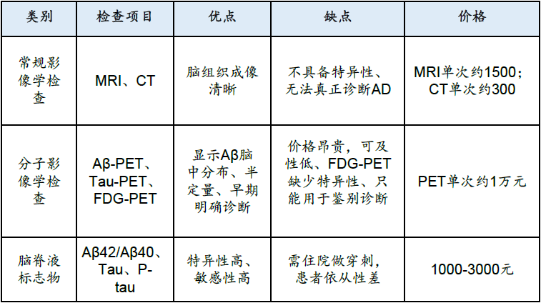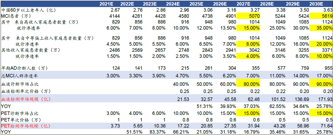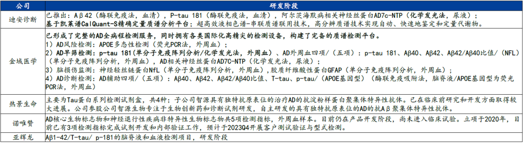 中国有983万AD患者,3877万MCI患者,就诊率极低 阿尔茨海默病(Alzheimer‘s disease,AD)是一种起病隐袭、呈进行性发展的神经退行性疾病,临床特征主要为认知障碍、精神行为异常和社会生活功能减退。中国年龄≥60岁老年人中,阿尔茨海默病患病率为3.9%,相当于有983万患有阿尔茨海默病。 图 | 中国70-79岁老年人的痴呆症患者数量最多(百万) 数据来源:《阿尔兹海默症患者临床就诊情况分析》,《2019年中国阿尔茨海默病患者家庭生存状况调研报告》,华福证券研究所 轻度认知障碍(Mild cognitive impairment,MCI),这是一个介于正常和失忆症之间的过渡状态。中国≥60岁老年人中,MCI整体患病率约为15.5%,有3877万MCI患者。 图 | 中国60-69岁老年人的轻度认知障碍患者数量最多(百万) 数据来源:The Lancet Public Health,华福证券研究所 AD患者就诊率极低,71.4%AD患者从未因痴呆症就诊过,97.2% MCI患者没有接受诊疗。接受就诊的患者中,约80%为中重度AD患者。只有14.4%AD患者服用胆碱酯酶抑制剂、美金刚等药物。超过一半的患者因为治疗效果不佳而停药,90%的患者表示愿意尝试新药。 AD治疗原则:尽早治疗,及时治疗,终身管理。1/3的MCI患者会在35年内进展为痴呆症,为治疗提供了时间窗口。如果病人能够接受早期诊断并采取早期的药物治疗,能够在一定程度延缓病情发展。 图 | 就诊时AD患者疾病严重程度及用药情况 数据来源:The Lancet Public Health,华福证券研究所 CSF和PET是目前早期AD诊断金标准,Tau-PET可预测认知能力下降速度 根据《阿尔兹海默症源性轻度认知障碍诊疗中国专家共识2021》,AD源性MCI的诊断与鉴别诊断主要包括神经心理评估、体液检查和影像学检查来联合诊断。Aβ-PET和Aβ脑脊液(CSF)检查两者结果存在很强的一致性,是目前早期AD明确诊断的主要方式。在整个AD疾病进展过程中,CSF Aβ/P-tau 217/以及AβPET在无症状个体中(MCI之前的阶段)可以被检测出增加,Tau-PET开始增加的时间相对较晚,伴随着脑萎缩和认知症状的出现(MCI),并随着疾病的进展而继续增加,Tau PET也被认为是预测认知能力下降速度的最佳方法。 表 | 阿尔兹海默的PET和CSF检查生物标志物及其优缺点 数据来源:《中国阿尔兹海默症报告2021》,头豹研究院,华福证券研究所 PET和CSF检查均有患者接受程度较低的缺点。CSF需要住院做穿刺,检查前需要评估患者凝血功能,腰椎穿刺步骤复杂,有感染风险,造成患者依从性较差。PET侵入性低,但PET单次约1万元,成本方面没有优势,且PET也有一定的辐射风险。 图表 | 从认知正常到轻度认知障碍最后痴呆的过程中生物标志物的变化 数据来源:The Lancet Neurology,华福证券研究所 质谱检测、Simoa技术和基于化学发光的检测方法是主要技术路线 在2023年的阿尔茨海默病协会国际会议(AAIC)上,NIA-AA公布了阿尔茨海默病最新诊断标准指南,明确将蛋白血浆生物标志物纳入生物标志物分类、疾病诊断和分期更新标准。目前研究表明,血液测试能够与新的AD疗法协同,有望成为测量Aβ蛋白的金标准。考虑到血液测试的成本和可及性较高,未来有可能替代CSF和PET检查。 图 | 血液检查的主要分析平台以及有前景的生物标志物 数据来源:Journal ofAlzheimer’s Disease Reports 7 (2023) 355–380,华福证券研究所 目前已开发和临床验证多种血浆生物标志物,包括血浆Aβ42/Aβ40、p-tau181、p-tau217、p-tau231、NfL和GFAP。但人体有血脑屏障,标志物从脑里渗透到血液的蛋白指标本身浓度极低,对检测方法的灵敏度要求极高。各生物技术公司试图从各个角度入手改进现有的蛋白检测技术,以突破超低丰度蛋白质检测的瓶颈问题。普遍分为3个技术流派:质谱仪检测(LC--MS)、超敏感的ELISA单分子免疫阵列技术(Simoa技术)以及基于化学发光的检测方法(ECL-based assays)。Simoa是一种超敏感的ELISA,使用抗体涂层珠与荧光共轭检测抗体和数字读数,而Simoa技术灵敏度比ELISA提高出1000倍以上,检测下限达到fg/mL,实现了超低丰度蛋白的有效检测和定量。 图 | Simoa使用荧光偶联的检测抗体和微孔来检测蛋白 数据来源:Raybiotech官网,华福证券研究所 血液检测可作为PET/CSF前的分流检测,约20%的患者可能需进一步诊断 CZN证明了其质谱方法检测Aβ40灵敏度10 -1780 pg/mL;,Aβ42为2 -254 pg/mL,低于在患者样本中观察到的浓度(在数千个临床样本中,Aβ40和Aβ42测量的最低浓度分别为163 pg/mL和12 pg/mL)。一项发表在神经领域核心期刊《Brain》的研究纳入10个公司的血浆p-Tau的性能比较,从检测方法来看,质谱检测的数据与脑脊液检测结果的相关性较好,其次为Simoa法;从标志物来看,P-tau217更有前景。 图 | Aβ阳性的二分和三分ALZpath pTau217参考范围 数据来源:medRxiv. 2023 Jul 12:2023.07.11.23292493.,华福证券研究所 备注:MRI,Aβ-PET和tau-PET数据可用于TRIAD和WRAP;脑脊液生物标志物包含在TRIAD和SPIN的一个子集。 ALZpath公司开发的基于Simoa技术的血浆ALZpath pTau217是目前图表:十个公司血浆P-tau的检测用于诊断早期AD的性能比较唯一可用于血浆P-tau 217商业测试的产品,与已建立的CSF和PET生物标志物相比,血浆ALZpath pTau217对Aβ和tau病变的诊断准确性相似或更高。对参考点创建了一个“中间”区域(pTau217水平在0.4-0.63 pg/mL之间),大约20%的个体落入“中间区域”,需要通过CSF或PET进行确认性检查。即这个方法可以用来作为PET/CSF前的分流检测,筛除Aβ阴性极低风险的的患者。 图 | 十个公司血浆P-tau的检测用于诊断早期AD