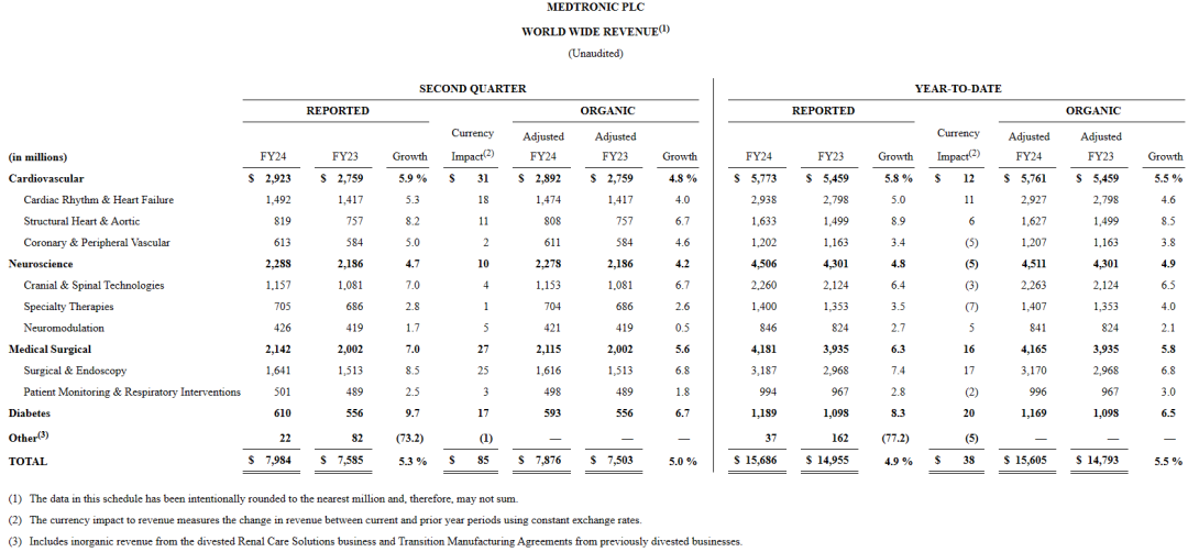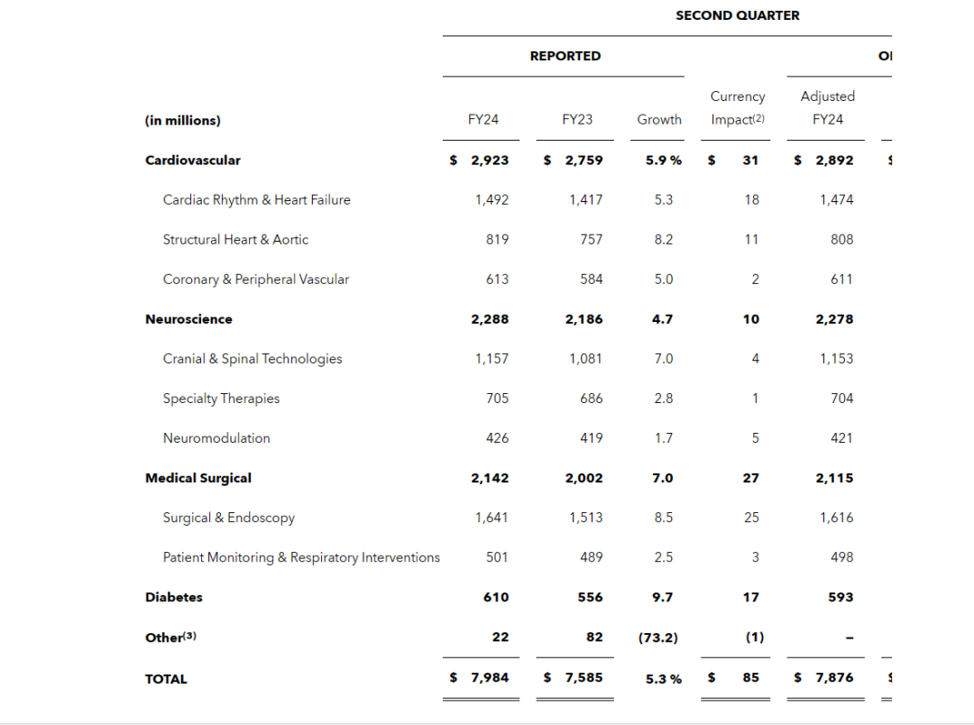 此外,该公司还在是生产制造和研发创新等方面进行了全方位布局,以降低“集采”对自身业务的影响。 美敦力首席执行官Geoff Martha曾公开表示,参加带量采购中标后,美敦力已经去除了大量的成本,包括销售和市场的(成本),去除这些成本可以减轻集采降价的影响,对美敦力来说,利润率少了,但是也还好。另外,美敦力正在投资中国,这是一个大市场,而且在增长中,预测在过去的财年,因为带量采购的业务下降,有望在2024财年开始持平,然后将重回高个位数甚至两位数的增长。 此次在2024财年第二季度财报电话会议上,美敦力也进行了新的回应,除了神经血管业务中的弹簧圈产品还收到带量采购影响外,带量采购带来的“逆风”影响似乎已经成为过去,美敦力预计将在2024财年末解决中国带量采购的影响。 2023年11月21日,全球最大的医疗器械公司美敦力公布了截至2023年10月27日的2024财年第二季度(FY24)财务业绩。报告显示,第二季度美敦力实现营收80亿美元(约568亿人民币),同比增长5.3%,有机增长5.0%,该公司将调高2024财年的有机收入增长和每股收益指引。 第二季度的GAAP(通用会计准则)净收入为9.09亿美元,同比增长113%,非GAAP净收入为16.67亿美元,同比下降3%。业绩增长,主要得益于稳健的执行力和多个业务和地区的广泛实力以及重大创新产品获批等。 心血管业务 心血管业务组合营收为29.23亿美元,同比增长5.9%,有机收入同比增长4.8%,其中SHA实现高个位数有机增长,CRHF和CPV实现中个位数有机增长。 神经科学组合 神经科学组合包括颅脑和脊柱技术(CST),专业疗法和神经调控部门。营业收入为22.88亿美元,增长4.7%,有机增长4.2%,其中CST有机增长高个位数,特殊治疗和神经调控有机增长低个位数。 医疗外科产品 医疗外科产品组合包括外科和内窥镜检查(SE)以及患者监测和呼吸干预(PMRI)部门。营收为21.42亿美元,同比增长7.0%,有机营收同比增长5.6%,其中SE实现高个位数有机增长,PMRI实现低个位数有机增长。 糖尿病业务 糖尿病业务收入为6.1亿美元,增长9.7%,有机收入增长6.7%。 多款创新产品获批 同时,美敦力多款创新产品官方获批。其中Aurora EV-ICD™系统(血管外植入式心律转复除颤器)和Symplicity Spyral™肾去神经(RDN)系统获批FDA。而Evolut™ FX经导管主动脉瓣植入(TAVI)系统、一体式Simplera™连续血糖监测仪(CGM)和PulseSelect™脉冲电场消融(PFA)系统则获得了CE认证。 上调财务指引 此外,美敦力还将24财年有机收入增长指引从之前的4.5%上调至4.75%。有机收入增长指引不包括外汇和与某些业务相关的收入的影响,这些业务被报告为其他业务。包括其他收入和外币的影响,如果截至11月初的外币汇率保持不变,24财年的收入增长将约为2.6%。 将24财年摊薄后非GAAP每股收益指引从之前的5.08美元至5.16美元上调至5.13美元至5.19美元的新区间,中点增长4美分。鉴于上个季度外币汇率的变化,外汇对24财年摊薄后非GAAP每股收益的影响现在估计在下半年将增加2美分,预计全年将产生6%的不利影响。 带量采购是国家医药卫生体制改革的重要举措之一。自2019年国务院颁发《治理高值医用耗材改革方案》,截至2022年末,国家层面已开展四次医疗器械的带量采购,聚焦心内介入与骨科等高值耗材领域。今年已进入医疗器械带量采购的第四年,随着带采规则逐渐成熟,国家医保局进一步要求各地区以省及省联盟的形式加速带量采购覆盖,不断扩大纳入品种。 目前,带量采购已覆盖医疗器械的各主要品类,在高值耗材、低值耗材、体外诊断试剂领域全方位开展。作为医改下的新常态,自2019年以来开展医疗器械以来,带量采购对医疗器械行业产生更为广泛与深远的影响,在中国医疗器械市场上国内外多家医疗器械企业都受到了或大或小的影响。 一方面,带量采购医疗器械的价格急剧下降,例如在“集采”之前,全膝关节置换系统的平均售价为数万元人民币元,而在集采后膝关节植入物的平均价格已降至几千元左右。另一方面,“集采”也推动了中国医疗器械行业的竞争加剧,一定程度上促进了国产替代,在部分医疗器械新增市场占有率上,国产械企已经超越跨国械企巨头。除此之外,带量采购还对医疗器械的供应链、研发创新等产生了影响。 不同抉择 面对带量采购政策带量,多家械企也做出了不一样的选择。国内械企拥有着价格、服务、效率等多方面的优势,在国产渗透率较低、生命周期较早的赛道,往往存在较大的增长空间。未来国内的医疗器械企业可以通过创新研发技术追赶和集采加速市场份额提升,顺利实现以价换量,保证稳定高增速模型。而跨国械企,有的进一步加码中国本土化生产制造和研发创新,有的则选择退出中国市场等。 强生董事会主席兼首席执行官Joaquin Duato就曾表示:“一方面,带量采购无疑代表着价格逆风。另一方面,这也代表着一个机会,因为你可以将优质产品和医疗技术推广到更多的患者。强生受影响的医疗科技业务在带量采购的逆风将持续到今年年底和2024年部分时间。同样,当我们展望2024年时,我们预计将继续在中国实现强劲增长,中国仍将是我们增长的关键部分。” 与之不一样的是,2023年3月初,从捷迈邦美(Zimmer Biomet)剥离出来的牙科和脊柱公司ZimVie,报告称第四季度业绩失利,外加受到中国国内脊柱带量采购的影响,公司宣布将其脊柱业务完全退出中国。另外,由于种植牙集采,其公司管理层也