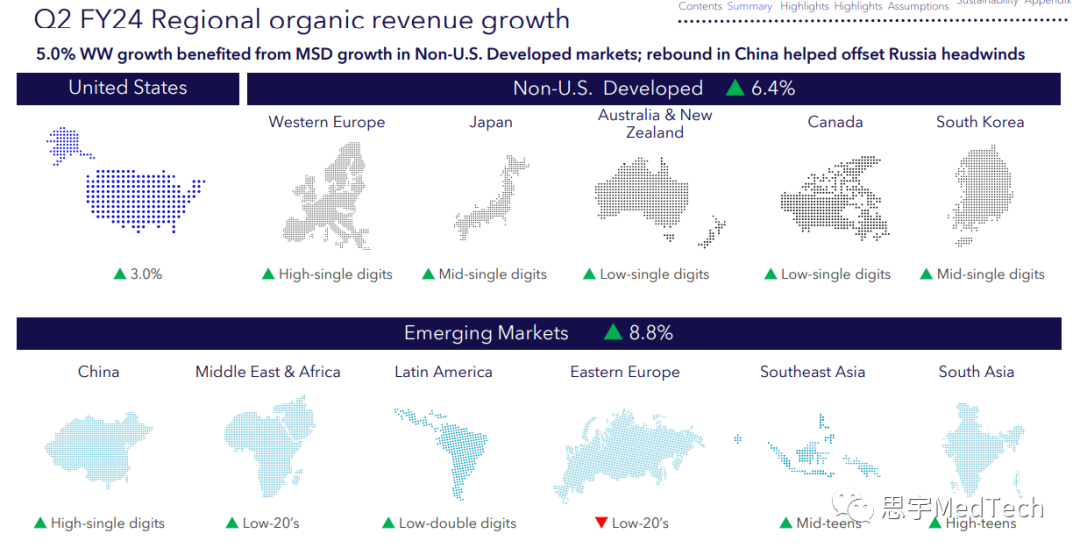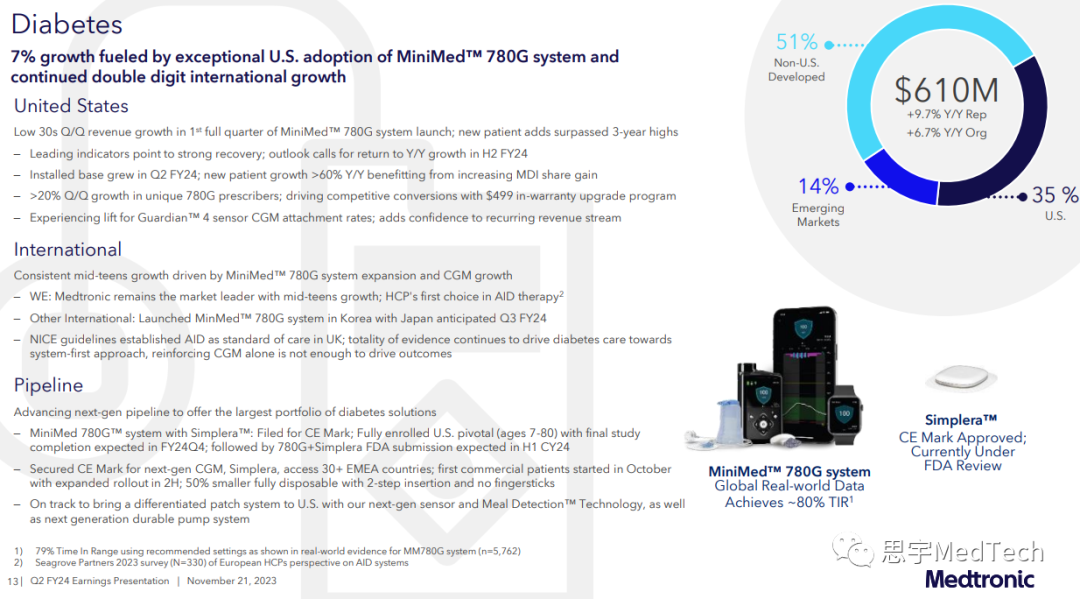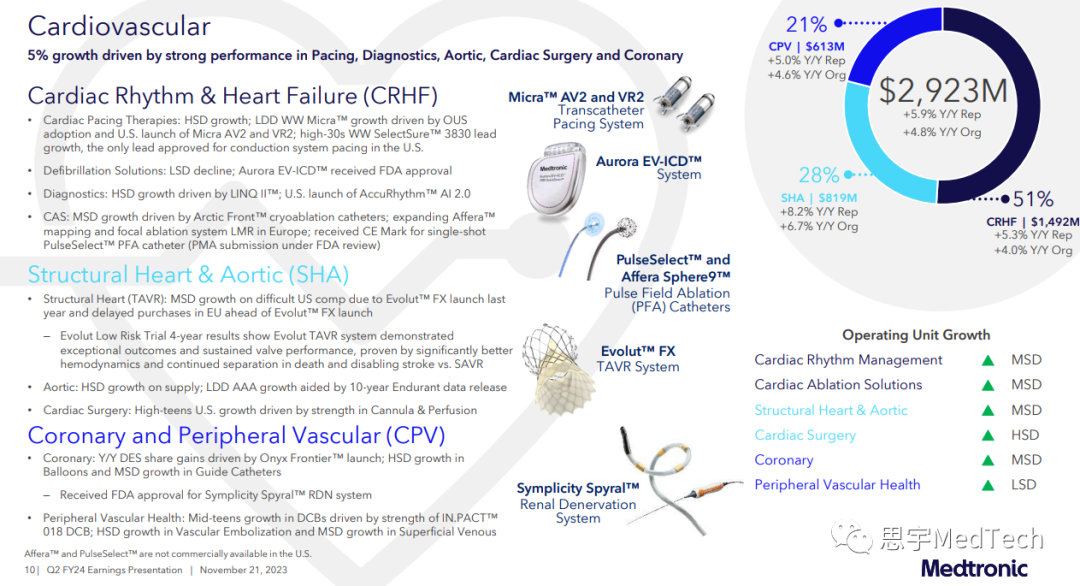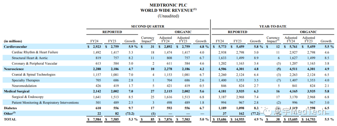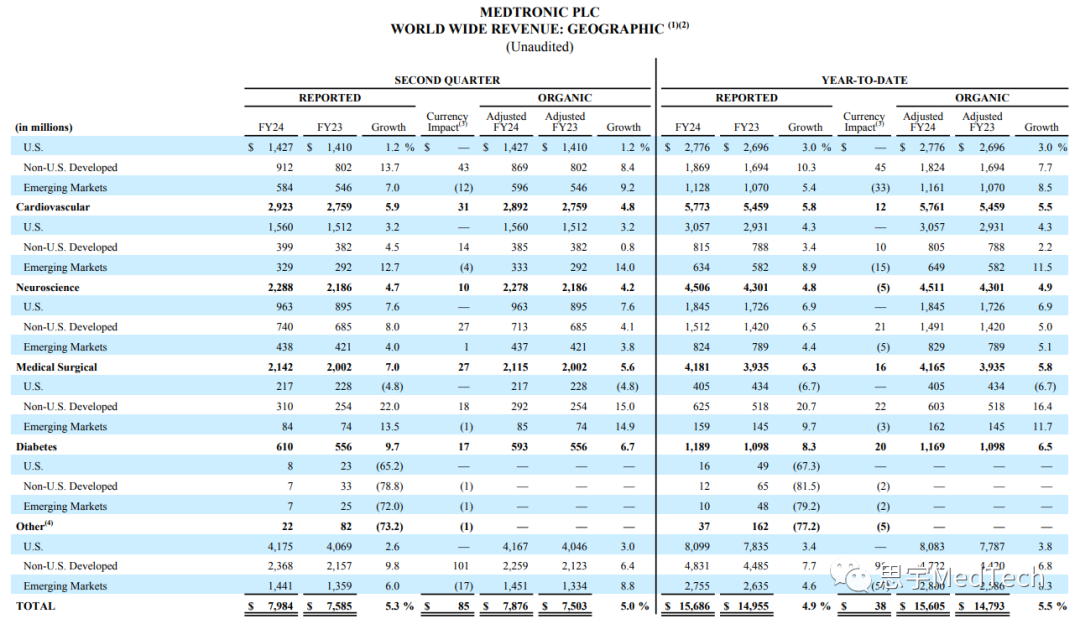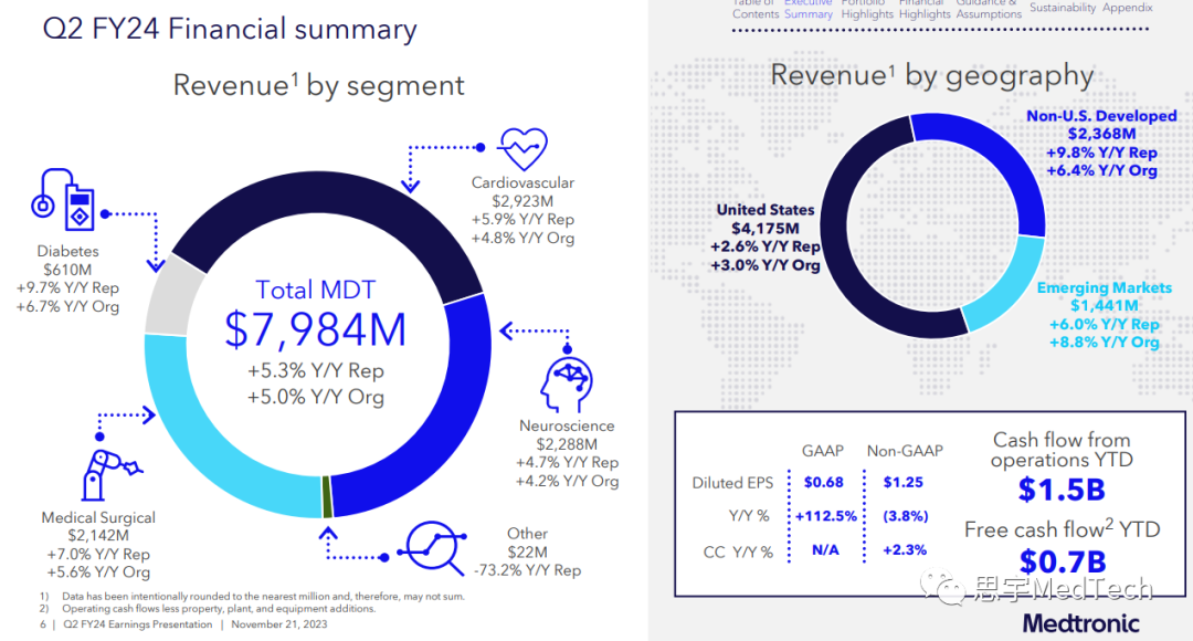 多款创新产品官方获批,其中Aurora EV-ICD™系统(血管外植入式心律转复除颤器)和Symplicity Spyral™肾去神经(RDN)系统获批FDA(回顾:美敦力:RDN系统获FDA上市批准!)。而Evolut™ FX经导管主动脉瓣植入(TAVI)系统、一体式Simplera™连续血糖监测仪(CGM)和PulseSelect™脉冲电场消融(PFA)系统则获得了CE认证。(产品按照叙述顺序从左至右对应下图)美敦力第二季度全球营收为79.84亿美元,同比增长5.3%,有机增长5.0%,第二季度的GAAP(通用会计准则)净收入为9.09亿美元,同比增长113%,非GAAP净收入为16.67亿美元,同比下降3%。心血管产品组合包括心律和心力衰竭(CRHF)、结构性心脏和主动脉(SHA)以及冠状动脉与外周血管(CPV)部门。部门营收29.23亿美元,同比增长5.9%,有机同比增长4.8%,其中SHA实现高个位数有机增长,CRHF和CPV实现中个位数有机增长。CRHF:心脏起搏疗法实现高个位数增长,其中Micra™经导管起搏系统实现了低两位数增长。而心血管诊断业务实现高个位数增长,心脏消融解决方案业务实现中个位数增长。SHA:主动脉和心脏外科业务实现高个位数增长。结构性心脏业务实现了中个位数的增长,这得益于Evolut™ FX在美国和日本不断推广。CPV:冠状动脉业务实现中个位数增长,其中Onyx Frontier™药物洗脱支架持续增长。外周血管健康业务实现低个位数增长,其中药物涂层球囊实现中等十几个百分点的增长。监管获批:Aurora EV-ICD™系统(血管外植入式心律转复除颤器)和Symplicity Spyral™肾去神经(RDN)系统获批FDA;Evolut™ FX经导管主动脉瓣植入(TAVI)系统和PulseSelect™脉冲电场消融(PFA)系统获得CE认证。实验进展:在2023年美国经导管心血管治疗学术会议(TCT)大会上公布了Evolut™低风险实验四年的结果,表明Evolut™ TVAR系统在试验中取得了非常出色的结果:瓣膜性能持久、血流动力学的表现更好、血栓形成率低。此外,四年里使用该系统的全因死亡率和致残性中风率相对于外科主动脉瓣替换(SAVR)更低。神经科学组合包括颅脑与脊柱技术(CST)、专业治疗(ST)和神经调节(NM)三个部门。该部门本季度营收22.88亿美元,同比增长4.7%,有机增长4.2%,其中CST实现有机高个位数增长,而ST和NM则为有机低个位数增长。CST:核心脊柱业务实现高个位数增长,其中AiBLE™生态系统的持续推广拉动了植入物的推广。神经外科业务实现中个位数增长,这是因为StealthStation™导航系统和O-arm™成像系统销售强劲。ST:神经血管业务实现中个位数增长,其中血流分流方面增长强劲。耳鼻喉(ENT)和盆腔健康业务(不包括产品线剥离则实现中个位数增长)实现低个位数增长。NM:靶向药物递送实现中个位数增长,疼痛刺激(Pain Stim)实现低个位数增长。医疗外科组合包括外科和内窥镜(SE)及患者检测与呼吸干预(PMRI)两个部门。该部门第二季度营收为21.42亿美元,同比增长7.0%,有机营收同比增长5.6%,其中SE实现高个位数有机增长,PMRI实现低个位数有机增长。SE:普通外科技术实现低两位数增长,高级外科技术实现中个位数增长,内窥镜业务实现低两位数增长。此外,Hugo™机器人辅助手术(RAS)系统安装基数增长,还获得了FDA的器械临床实验豁免(IDE),开始了在美国临床上用于疝气手术的实验。PMRI:患者监护实现低个位数增长,其中Nellcor™脉搏血氧饱和监测仪的销售额实现两位数增长。因为气道业务的高个位数增长抵消了呼吸机销量下降的影响,呼吸介入业务的业绩基本没有变化。糖尿病业务的营收为6.1亿美元,同比增长9.7%,有机增长6.7%。其中,在除美国之外的发达国家市场,因为MiniMed™ 780G系统的继续推广以及在Guardian™ 4传感器的支持下,连续血糖监测仪(CGM)使用率的增加,糖尿病业务实现了中等十几个百分点的增长。MiniMed™ 780G系统在美国完整上市第一个季度后,糖尿病泵在美营收环比增长低三十个百分点。总体而言,与上一年同期相比,因为客户流失,在美的糖尿病业务下降了中个位数,不过糖尿病业务客户群体的基数环比增加。一体式、一次性Simplera™连续血糖监测仪获得CE认证,并分阶段推向市场。第二季度美敦力在美营收41.75亿美元,同比增长2.6%,有机增长3.0%;在美国之外的发达国家营收则为23.68亿美元,同比增长9.8%,有机增长6.4%;在新兴市场营收14.41亿美元,同比增长6.0%,有机增长8.8%,其中在中国实现了高个位数的增长。财年年初至今运营现金流为15亿美元,自由现金流为7亿美元。美敦力的董事长兼首席执行官Geoff Martha表示:“美敦力正持续取得营收的稳定中等个位数增长,基本面强劲,在不同业务领域和地理区域都取得了良好的业绩表现。我们公司正在面向市场推出一些革命性产品,近期多款产品获得了监管部门的批准,同时还推出了一些重要产品。因此,我们相信公司有能力继续实现稳健增长。” 发布第二季度财报之日,该公司上调了2024财年的营收增长和每股收益指引。美敦力将2024财年的有机收入增长指引从之前的4.5%上调至4.75%。如果截至11月初的外币汇率保持不变,2024财年的收入增长将约为2.6%。 美敦力执行副总裁兼首席财务官Karen Parkhill表示:“我们的营收、边际收益以及净利润都超出了预期,总的来说,公司这一季度表现不错。……考虑到我们已经对运营模式、激励措施和资本配置以及其他驱动因素做了改变,我们现在把公司定位为在营收上实现持续的中个位数增长。未来,这种将持久的收入增长转化为持久的盈利能力仍然是我们公司工作的重中