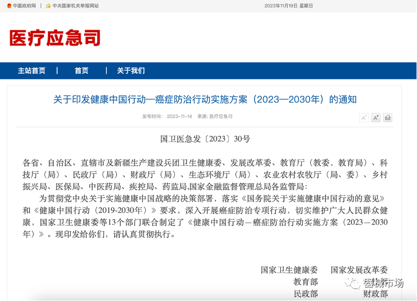 2023年11月15日,国家卫生健康委、国家发展改革委等部门15日发布了心脑血管疾病和癌症防治行动实施方案,其中多项内容将直接影响未来器械市场格局。 我国重大慢性病过早死亡率从2015年的18.5%下降到了2022年的15.2%,此次发布《健康中国行动——心脑血管疾病防治行动的实施方案(2023-2030)》和《健康中国行动——癌症防治行动实施方案(2023-2030)》明确,要从源头入手为癌症和心脑血管疾病的防治提供支持和保障。 《健康中国行动—心脑血管疾病防治行动实施方案(2023—2030年)》国家将心脑血管疾病防治工作纳入《“健康中国2030”规划纲要》《中国防治慢性病中长期规划(2017-2025年)》等重要政策文件,并在《健康中国行动(2019-2030年)》15个专项行动中设立“心脑血管疾病防治行动”。 方案明确,到2030年建立覆盖全国的心脑血管疾病综合防控和早诊早治体系;各级医疗卫生机构的心脑血管疾病防治能力和质量进一步改善,心脑血管疾病防治技术取得较大突破,心脑血管疾病死亡率下降到190.7/10万以下。 此次发布的新版心脑血管疾病防治实施方案明确,要“实施危险因素控制,降低发病和死亡风险”、“强化关口前移,创新心脑血管疾病同防同治路径”。加大基层医疗机构血压、血糖、血脂“三高共管”力度。到2030年,高血压、糖尿病患者基层规范管理服务率均达到70%,治疗率、控制率在2018年基础上持续提高,35岁以上居民年度血脂检测率达到35%。探索将冠心病、脑卒中患者的二级预防和康复治疗纳入家庭医生签约服务范围。新版癌症防治实施方案提出七方面重点工作:控制危险因素,降低癌症患病风险;完善癌症防治服务体系,加强信息共享;推广癌症早诊早治,强化筛查长效机制;规范癌症诊疗,提升管理服务水平;促进中西医结合创新,发挥中医药独特作用;加强救助救治保障,减轻群众就医负担;加快重大科技攻关,推广创新成果转化。具体内容包括:到2030年,所有二级以上医院卒中中心均开展静脉溶栓技术。有条件的地方通过建立胸痛和脑卒中“急救地图”,切实提高救治效率。推动心脑血管疾病相关医疗质控中心地市级全覆盖,并延伸至50%以上县域等。国家卫健委下一步将推进慢性病防治的关口前移和全流程管理,多措并举加强心脑血管疾病综合防治。《健康中国行动—癌症防治行动实施方案(2023—2030年)》