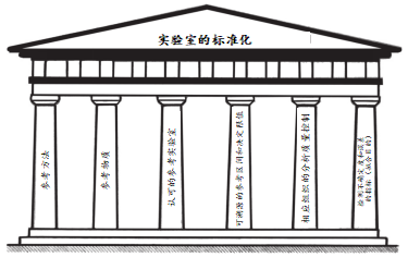 溯源性到一个共同参考(理想地到国际单位制[SI])确保不同检测系统得到的检测结果的高质量和长期等同。检测结果的溯源性可以通过一条不间断的校准序列,每个序列对临床样品(CS)结果给予了不确定度。参考物质(RM)已经被叙述为实验室标准化犹如一个庙宇的六根大柱之一,与参考检测系统的其他经典的关键要素(即,较高等级的参考程序和参考实验室对这些程序的实施),可溯源的参考区间和决定限值、符合计量指标的分析质量控制计划、和建立适合目的的检测不确定度和误差的指标(如附图所示)。
