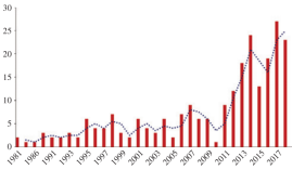 Fasce等于1973年第一个定义的互换性为“一个酶物质的能力,显示了检测间的活力变化,与人血清中相同的酶的活力变化,是可比较的”。这个定义以后被延伸作为所有RM的特性[5]。除了在45年前发生了第一次叙述互换性外,在概念上依然很难理解和和领会。有时候,词语互换性被错误地应用到分析方法或试剂,而不是考虑它为RM的性质。一些人依然将“互换性”和检测结果的“可比性”混淆了。Tietz的临床化学教科书,从第一版到第三版没有提及互换性;直至第4版(2006)上强调了互换性的定义,到最后的第6版(2018)将这个概念成为“质量控制”章的一个部分。另外,尽管该词语自从1980早期出现在学术发表上的标题上,但发表的数量每年为个位数,直至近期的10年里有了变化(图2)。