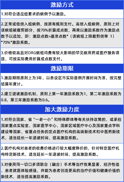 《试行办法》明确:对于符合条件的创新医疗服务项目(含医用材料),提高DRG激励总额,各设区市医保部门可按本年度DRG清算总额的一定比例确定激励总额,并稳步加大激励力度。
