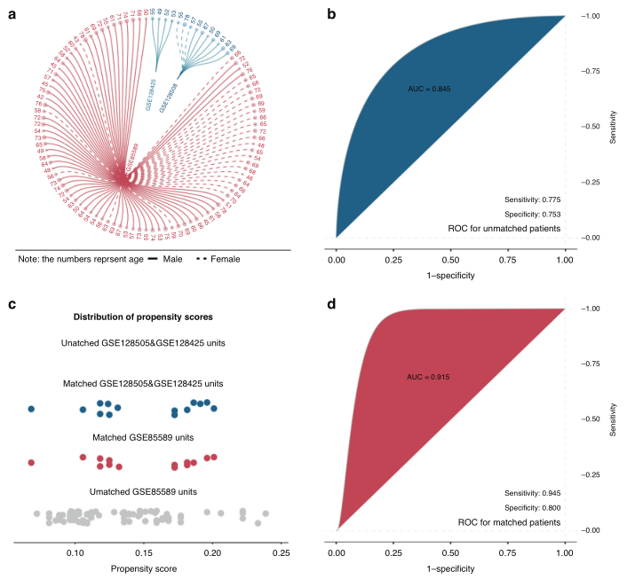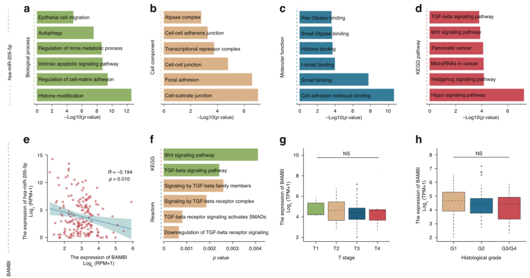 胰腺癌(PC)是一种高度侵袭性的癌症,在标准护理治疗下诊断后的5年生存率约为5-10%。PC的高死亡率主要是52%的PC病例被诊断为晚期,此时很少有患者能够接受治疗干预。因此,早期发现前列腺癌对改善整体预后起着至关重要的作用。 液体活检等微创方法为早期PC检测带来了希望。临床中广泛应用的胰腺肿瘤血清学标志物是CA19-9,但其在特异性、敏感性和对总生存期(OS)等结果的预测价值方面受到了挑战。其他血液生物标志物,如循环肿瘤细胞(CTCs)、外泌体、循环肿瘤DNA (ctDNA)或cfDNA,在其临床适用性和作为生物标志物的验证方面存在主要障碍。例如,ctDNA/cfDNA在PC中应用的主要挑战之一是外周DNA水平极低,这可能对早期疾病敏感性产生重大影响。ctDNA中的DNA甲基化分析需要更多资源,这限制了该技术在常规使用中的临床应用。相比之下,成熟的miRNA在体液中高度稳定,并在不同的癌症类型中表现出特殊的特异性,体液中肿瘤miRNA标志物的筛选在协助疾病的早期诊断和纵向监测治疗成功方面具有重要的临床价值。 近日,一组来自德国的研究团队在杂志British journal of cancer上发表了一篇题为“Integrating a microRNA signature as a liquid biopsy-based tool for the early diagnosis and prediction of potential therapeutic targets in pancreatic cancer”的文章。作者将机器学习算法与现实世界和公共数据库分析相结合,用于PC中循环miRNA的早期筛选。通过四种机器学习方法,使用最热门的候选标记物来评估预测胰腺癌的准确性。最后,作者探讨了临床预后价值,候选靶点,并预测可能涉及的调节细胞生物学机制。研究表明,此研究结果可能有助于进一步发展早期检测策略,通过使用微创筛查工具进行PC诊断和预后。 图片来源:British journal of cancer 主要内容 与邻近非肿瘤组织相比, 胰腺癌血清和组织样本中的miRNA上调 作者分别在实验室组织数据集(OLMS-T , 13 PC vs. 13 HT samples)以及GSE112264 (50 PC vs. 41 HT samples)和GSE109319 (24 PC vs. 21 HT samples)的血清数据集中分析了PC正常组织和肿瘤组织之间的miRNA表达情况。结果显示,OLMS-T数据集中PC组织中有66个差异化表达miRNA(DEM)上调,GSE112264和GSE109319数据集中PC血清中分别有418和267个DEM上调(图a-c)。作者选择RRA方法选择在肿瘤组织和血清中均表达升高的关键miRNA。作者选择了四种miRNA包括hsa-miR-6819-5p、hsa-miR-1246、hsa-miR-205-5p和hsa-miR-191-5p(图d)。实验室验证这四种miRNA在患者血清中的表达时,将hsa-miR-6819-5p排除 (图e)。 差异基因表达分析及特征miRNA鉴定。 图片来源:British journal of cancer 血清miRNA可准确预测胰腺癌的存在 在训练集中,随机森林(RF)算法显示三种miRNA(hsa-miR-1246, hsa-miR-205-5p和hsa-miR-191-5p)可以预测PC,准确率高达95.8%(图a)。CART、SVM和LR算法也显示出较高的预测精确度。曲线下面积分别为0.868、0.830、0.823(图b-d)。在测试数据集中,这三种miRNA也比传统的血清标志物显示出更好的预测PC的准确性。四种方法的预测模型准确率分别为94.4%、84.9%、82.3%和83.3%(图e-h)。在真实世界研究中,根据RF算法,该miRNA特征可以根据血清样本区分PC患者和健康患者,准确率为82.3%(图i);CART的准确率为83.5%,SVM的准确率为79.0%,LR的准确率为82.2%(图j-l)。 四种机器学习算法验证了microRNA panel的预测效果。 图片来源:British journal of cancer 血清miRNA特征区分胰腺癌和慢性胰腺炎 本研究共纳入了三个PC和慢性胰腺炎数据集,下图a显示了这些参与者的基线信息。在倾向评分匹配(PSM)之前,区分PC和胰腺炎的血清miRNA特征的预测准确率为84.5%(图b)。在PSM消除了3个数据集之间的基线差异之后,使用随机森林分析,此miRNA特征在患者血清中区分胰腺炎和PC的可预测性提高到91.5%的准确性(图d)。 三种血清miRNA panel可以区分胰腺炎和胰腺癌。 图片来源:British journal of cancer 血清hsa-miR-205-5p的高表达 与临床预后差和肿瘤切除不完全相关 分析hsa-miR-205-5p在TCGA-PAAD队列中的表达时,作者发现性别、年龄或种族之间没有显著差异,但在高T期或疾病组织学分级阶段较晚的患者中转录物丰度增加(图d, e)。R1/2切除组的血清hsa-miR-205-5p表达高于R0切除组(图f)。这些结果表明,hsa-miR-205-5p可以作为更晚期疾病的预测标志物。此外,在生存分析中,高表达hsa-miR-205-5p的患者在OS、DSS和PFI方面的预后总是比低表达hsa-miR-205-5p的患者差(p = 0.05, p = 0.011, p = 0.002)(图g-i)。 新型血清生物标志物hsa-miR-205与临床因素的关联。 图片来源:British journal of cancer 预测胰腺癌中hsa-miR-205-5p的上下游靶点 CLIP(交联免疫沉淀)数据共预测了hsa-miR-205-5p的1616个候选靶点,基因本体富集分析表明,这些靶点可在上皮细胞迁移、自噬和细胞-细胞粘附连接中富集(图a-c)。信号通路分析表明,上述靶点可能参与TGF-β信号通路以及系统发育保守的干细胞信号通路,如Wnt和Hedgehog信号通路(图d)。 为了确定可能的下游靶点,在对hsa-miR-205-5p与其在PC中的靶点进行相关性分析后,作者发现只有BMP激活素膜结合抑制因子(Activin Membrane-Bound Inhibitor, BAMBI)的表达与hsa-miR-205-5p的表达水平呈显著(负)相关。作者进一步探索BAMBI基因在PC中的潜在机制,途径富集结果表明该基因可能参与Wnt信号通路和TGF-β信号通路(图f)。考虑到hsa-miR-205-5p也在相同的通路中富集,作者推断hsa-miR-205-5p可能靶向BAMBI激活TGF-β通路,进而促进胰腺癌的发生。 预测hsa-miR-205及其候选靶点BAMBI的机制功能。 图片来源:British journal of cancer BAMBI mRNA高表