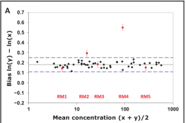 IFCC互换性工作组对参考物质评估的实验要求 互换性评估方案对涉及互换性评估中的每个参与者,都做了明确的要求和规定。不能因为参与实验人员的水平问题严重影响最后的结果。参考物质为RM(Reference Materials);临床样品为CS(Clinical Samples);比对的方法为MP(Measurement Procedure);比对的检测系统MS(Measurement Systems);文章中将方法学一样的任何检测系统都视为一个MP。 1、 互换性的定义 VIM定义的互换性为:某个RM(参考物质)的性质,按照2个给定的MP(检测程序,即超过使用的检测方法或系统)得到了在这个物质内某个规定量的检测结果的关系、以及对其他特定物质检测结果间得到的关系间的一致性。对于医学实验室,其他特定物质是CS(临床样品),预期用于检测,量值通常为被测量。CS可能来自健康的志愿者、或有病的患者。一个RM互换性的定义关注2个MP。 IFCC关注的处理过物质指的是:参考物质、正确度控制品、和能力验证的调查样品。没有一个关心的处理过样品,是我们常规实验室每天遇到的。 2、互换性的评估 互换性的评估要求以下步骤:(a)得到被评价的RM;(b)得到代表性的CS(临床样品);(c)在互换性评估中使用MP检测RM和CS;(d)应用某个程序评价RM结果的互换性,即与CS结果的关系。近期可用的程序,去评估互换性使用的指标,仅依据在2个MP间CS结果差异在统计上的分布;这样,该指标会随着不同精密度性能的MP的不同组合有差异。互换性评估的指标应对所有评估中的MP是一样的,应依据在RM和CS间对使用实验室检测结果确定的医学决定差异的影响。在部分2和部分3的统计方法,展现了互换性评估程序,可以依据在RM和CS间结果上医学关联的差异为依据的指标(1,2)。(注:这里,IFCC对互换性评估方案的第一个严格要求:即互换性评估的指标应对所有评估中的PM是一样的,应依据在RM和CS间对使用实验室检测结果确定的医学决定差异的影响。) 这是IFCC互换性方案与美国EP-30方案完全不同的!也即千万不可将评估方案实验结果,仅仅进行回归处理,以形成回归线的所有实验点的95%分布范围,作为互换性评估可接受的简单处理。在IFCC方案中明确规定,必须以实验检测结果对医学决定影响,作为确定互换性判断指标! 即RM互换性最大的允许偏移,被考虑足以满足它的预期用途的医学性能要求。这样的要求才可从互换性评估实验方案中予以考核。这是在RM和CS间结果上医学关联的差异为依据的指标。 依据部分2方式的互换性评估示例,见图1。一组CS和5个候选的RM显示了2对MP间的偏移(x和y;x和z)。相对偏移在整个CS的浓度区间内是恒定的;结果,CS的平均偏移适合评估在检查的每个RM浓度。每个RM的误差范围(即重复检测所有结果的分布)指示了RM间偏移和CS平均偏移的差异的不确定度。不确定度组成了2个成分:CS偏移的估计的不确定度,和每个RM偏移估计的不确定度。 图1中蓝色虚线指示了预定的RM互换性最大的允许偏移,被考虑足以满足它的预期用途的医学性能要求。指标与检查用的所有对MP相同。在包括在误差bar条RM的偏移完全在蓝色虚线内时,则某RM是可互换的。在图1A中,RM1、RM3和RM5与CS是可互换的,因为它们的偏移,包括误差条,在蓝色虚线之内。但RM2和RM4与CS不是可互换的,因为误差条完全在蓝色虚线之外。在图1B,指标相同,因为依据医学使用要求。但是在CS结果上离散得多,说明MP z具有很大的随机误差成分。增大的离散反映在很大的误差条上,现在使得RM1、RM2和RM5的互换性不确定,因为误差条超出了蓝色虚线。互换性评估展现在图1的示例,反映了CS和MP的数据,qualify被包括在以下章节中叙述的评估。 图1、显示了一组CS(黑菱形)和5个候选RM(红方块)相对于每个MP检测的平均浓度在两个检测系统间浓度转换[ln(浓度)]的偏移。 每个RM的误差条(即所有检测结果的分布)指示了在每个RM和CS平均偏移间差异的不确定度。ln-转换结果的偏移值可以乘上100给出一个大致的百分偏移。黑色直线是所有CS的平均偏移(18%)。蓝色虚线指示了对RM被考虑与CS可互换的最大允许关联互换性偏移。(A)显示了2个MP(x和y)的结果,因MP的随机误差和样品特异的影响reasonably相当地小。(B)显示了2个MP(x和z)的结果,其CS结果较离散,建议MP z具有交叉的精密度,和/或在与MP x上有较大的样品特异影响。 转载请注明出处 微信公众号:冯仁丰 |