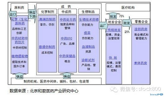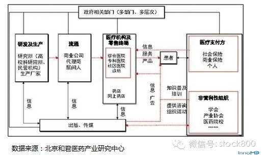 上图描绘的是中国的医疗保健体系,我们看一下,整体来说这个行业受政府的管制非常多,而且是多部门、多层次的管理。从研发、生产、到流通、终端(医院和药店)、患者,再到医疗支付、非营利性组织、出版传媒等,构成了整个体系,体系内的各个环节间相互关联。所以,在这个体系里,每一个环节都不能孤立的去考虑,而是要全面系统的思考。在这张图的基础上,进一步深化,绘制出各个环节的产业地图。 下图:药品生产和流通的示意图