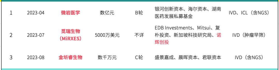 先看一张汇总图: 简单写写,欢迎拍砖,如遗漏,请留言补充。 2023年,基因测序行业的融资,有以下特点: (1)从产业链企业分布来看,2023年内融资主要集中在产业链上游,即测序仪上游制造端。 以NGS测序仪为主,如赛纳生物、真迈生物、铭毅智造、赛陆医疗; 纳米孔测序厂家:今是科技、梅丽科技、普译生物; 投资的逻辑,主要基于“硬科技”、“国产替代”、“测序应用的想象空间”; 华大智造在2022年顺利上市及业绩表现、齐碳科技在2022年末拿到的7亿元融资,对上游赛道的融资有所助力。 (2)国产单细胞测序赛道今年拿到两笔融资:德运康瑞、墨卓生物。 国产单细胞测序赛道,2022年是细分赛道融资高峰,今年融资数量腰斩。 赛道已进入商业化的关键年份,10余单细胞测序国产厂家同台竞技,市场竞争异常惨烈。 资本在观望:这个市场到底有多大?谁能跑出来? (3)产业链中游,2023年未见大额融资;年度内,仅有mNGS、tNGS感染领域的“微岩医学”拿到B轮融资; 未见遗传赛道、肿瘤赛道其他相关企业。 可能原因,产业发展不及预期致资本信心受挫、赛道企业前期估值过高; 后期融资关键要素:企业需证明自我造血及盈利能力、关键资质、关键应用市场的突破。 (4)从融资轮次来看,2023年内融资主要集中在中后期,早期及超早期融资较为困难。 可能原因:相同细分赛道已拥有一定数量玩家,后继者的机会(如技术趋同)需要谨慎评估。 (5)从融资用途来看,2023年年内融资,主要应用于新产品开发、产品注册、商业化拓展等,偏向企业商业化运营阶段;对早期概念阶段、纯研发阶段的投入较少。 (6)传统IVD、ICL龙头开始横纵向布局,如金域医学、安图生物、万孚生物、诺辉健康等;委身巨头不乏是创业企业路径之一( 详见:“巨头”围剿NGS企业:一些信号与拐点)。 (7)投资方多见国资背景。 整体来看,行业尚未出清,资本观望态度浓厚。 考验大家自我生存能力的时候又又又到了! |