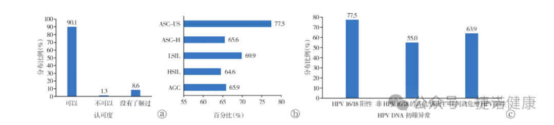 多项研究证实宿主六基因甲基化检测在HPV阳性人群分流中有良好的应用价值。本次调研结果显示,90.1%的调研对象认为DNA甲基化检测可用于子宫颈癌筛查异常的分流管理。77.5%的调研对象认为HPV16/18型阳性者、60%以上认为TCT≥ASCUS时,可考虑进行宿主六基因甲基化检测分流,并且认为HPV16/18阳性且有生育需求的女性更适用宿主六基因甲基化检测联合阴道镜检查。