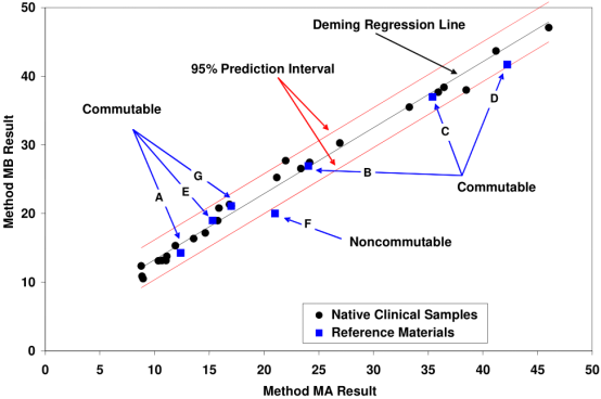 图2、使用回归方案和95%的预示区间,评价方法MA和MB间的互换性。图中,候选RM A、B、C、D、E和G,与临床样品在方法MA与MB间具有互换性;但候选RM F是不可互换的。因为候选F超出了临床样品比较中的95%预示区间之外。图中的两条红线是方法MA和MB对所有临床样品比较结果的95%预示区间。