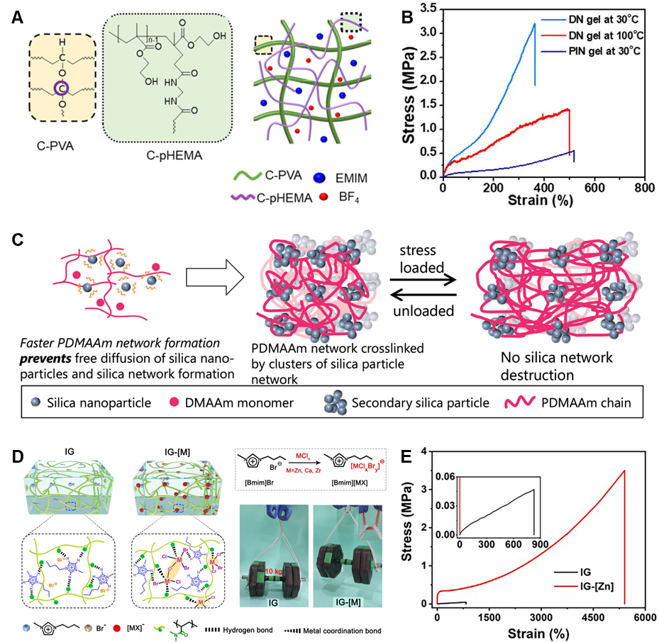 图3. 提升离子凝胶机械性能的策略。  尽管离子凝胶领域已经取得了一系列的重要进展,但仍面临着许多挑战。首先,离子凝胶是一类复合材料,内部结构与相互作用十分复杂,其结构表征及构效关系仍然是目前的研究难点。其次,虽然离子凝胶理论上可以兼具优异的机械性能与导电性,但在目前研究中其机械性能与导电性往往呈负相关。另外,离子液体的生物毒性使得离子凝胶的生物相容性仍存在一定的问题,影响了其在生物医药领域中的应用。另外,虽然可回收利用的离子凝胶取得了一定的进展,但其最终的可降解性能仍然是一个值得关注的问题。总的来说,离子凝胶仍处于发展的初级阶段,作者希望通过这篇综述文章促进该领域和相关领域的快速发展,为离子凝胶在生产生活中的实际应用铺平道路。文献链接: https://doi.org/10.1002/adfm.202314408