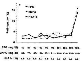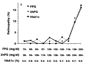 特别请大家要关注的是,三个临床试验观察,突出了:尤其是NHANES III的40-到74岁参加者的发病率,相当于FPG≥120 mg/dl、2hPG≥194 mg/dl、和HbA1c≥6.2%情况下,导至视网膜病变大发病率开始快速上升。由于上述三个临床试验有限每个样本中视网膜疾病有限个数(在Pima研究中为32例,Egyptian研究中146例、NHANES III中为111例)。没有绝对的临界判断限值,因为一些视网膜病变发生在所有葡萄糖水平,主要因为检测或疾病变异,和因为视网膜病变的非糖尿病原因。