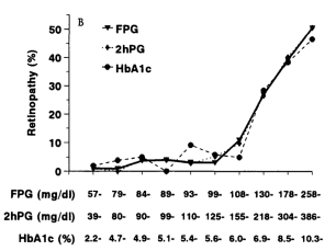 尽管在DCCT临床试验中,也观察过HbA1c与糖尿病病人发生视网膜病变的关系。但在原始的发表内容中,绘制的HbA1c浓度与视网膜病变的关系,没有突出HbA1c超出6.0%以后,对病人发生视网膜病变的严重关系。(见下图)。