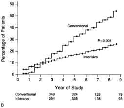 我的注解:请注意看上图B;这是二级介入组的表现。在临床试验的18个月的时间后,强化治疗组内,发生视网膜病变的群体中的百分率突然升高,将接近传统治疗组。这样的早期变坏,临床医生怀疑强化治疗具有的作用)。这篇文章强调是与以往发现最一致的表现。这点是我以往没有注意到的!