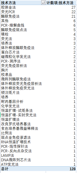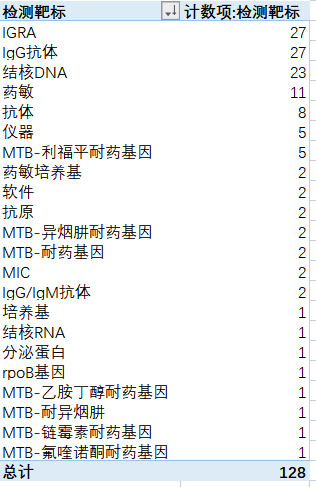 按照检测技术来看: 排在第一位的是胶体金技术,该技术主要用于结核抗体的检测。 排在第二位的是荧光PCR技术,该技术主要用于结核DNA的检测排在第三位的是酶联免疫技术,该技术主要用于IGRA检测而PCR-熔解曲线则主要用于结核二线耐药基因的检测