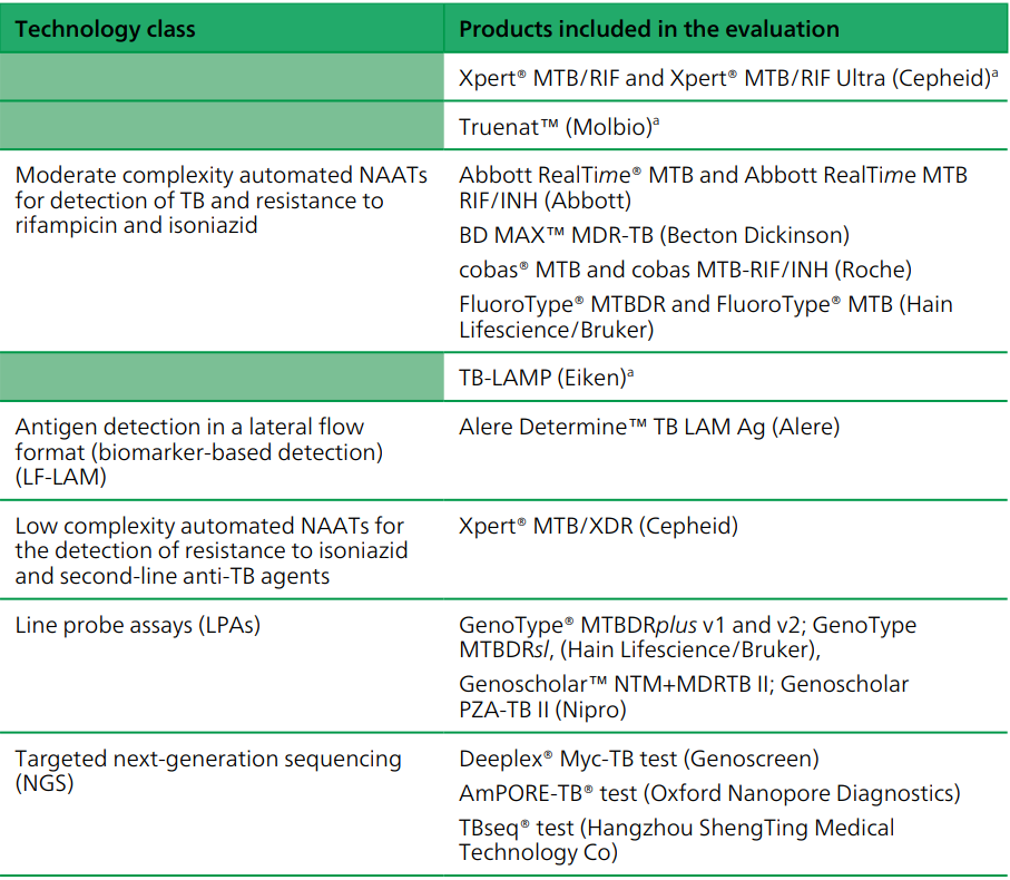 推荐产品系列2:Truenat MTB,MTB Plus和TB-RIF Dx检测法 MolBio Diagnostics:Truenat MTB\MTB Plus and Truenat MTB-RIF Dx(印度)推荐用途:对于有肺结核症状和体征的成人和儿童作为肺结核的初始诊断检测 推荐用途:对于有肺结核症状和体征的患者,可在呼吸道样本中使用NAATs检测肺结核以及利福平和异烟肼耐药性 推荐产品系列4:环介导等温扩增(Loop-mediated isothermal amplification,LAMP)技术(日本)推荐用途:对于有肺结核症状和体征的成人,TB-LAMP可替代痰涂片镜检诊断肺结核或作为痰涂片镜检的后续检测,尤其是在需要进一步检测痰涂片阴性标本时。 推荐产品系列5:侧流尿脂阿拉伯甘露聚糖测定法(Lateral flow urine lipoarabinomannan assay,LF-LAM)- Alere Determine™ TB LAM Ag (Alere)(美国)