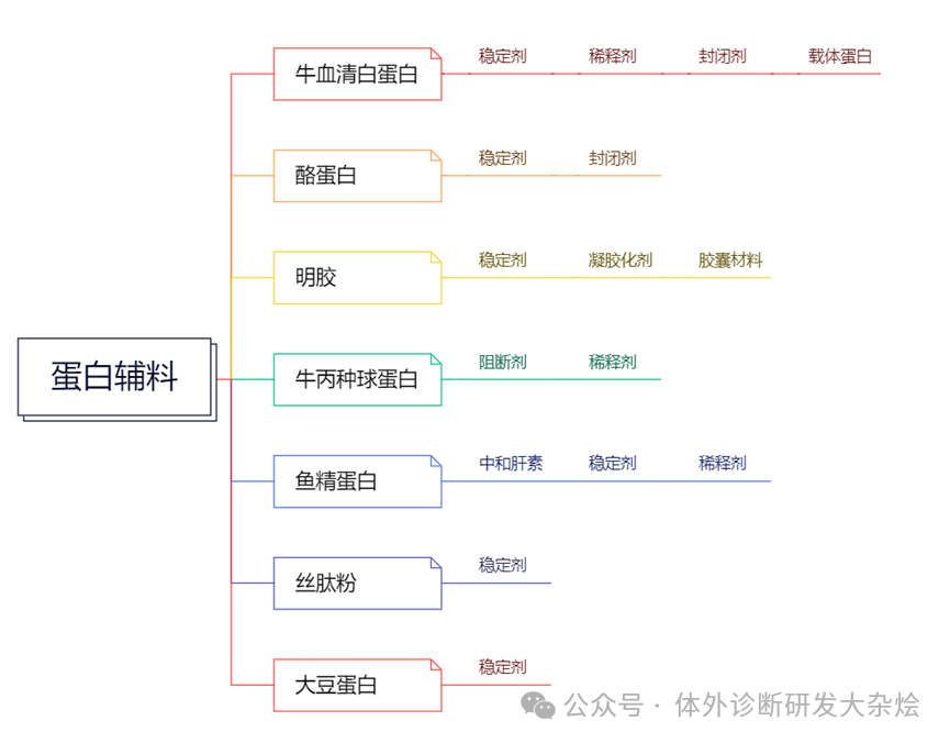 蛋白辅料作为诊断试剂的重要组成部分,其应用范围广泛。这些生物大分子不仅为诊断试剂提供了必要的生物学活性,还确保了试剂的稳定性和准确性。在这篇文章中,我们将探讨常用的蛋白辅料如何在诊断试剂中发挥作用,以及使用时的一些相关注意事项。 牛血清白蛋白(BSA)是一种在生物研究和体外诊断试剂中广泛使用的蛋白质。它具有多种生物学功能,在诊断试剂中的应用包括稳定剂、稀释剂、封闭剂和载体蛋白等。BSA可以保护诊断试剂中的生物分子,如抗体、酶和抗原,防止它们在储存和处理过程中发生变性或降解;在进行ELISA、CLIA等诊断测试时,BSA常用于稀释抗体或其他试剂,以减少非特异性结合和提高检测的准确性;BSA也用于封闭未结合的蛋白结合位点,减少背景信号,提高检测灵敏度;BSA 可以作为载体,将其他生物分子(如抗体、抗原等)结合到其表面,从而提高这些分子的稳定性和溶解性。使用的注意事项:确保BSA不含有内毒素、蛋白酶和其他污染物,这些可能影响诊断试剂的性能;要关注BSA的制作工艺,不同工艺生产的BSA其封闭效果有差异;虽然BSA的免疫原性较低,但在某些情况下仍可能引起交叉反应,因此在选择时应考虑这一点;BSA的浓度和用量应根据具体实验条件和试剂要求进行调整,过量使用可能导至非特异性结合。 酪蛋白是一类在牛奶中发现的磷蛋白,主要由酪蛋白酸和κ-酪蛋白组成。它在诊断试剂中的应用包括稳定剂和封闭剂。酪蛋白通过表面的疏水区与敏感蛋白(如抗体、酶等)相互作用,形成一种保护性的复合物,从而减少蛋白质的变性;在一些BSA封闭效果不佳的项目中,酪蛋白能有更好的封闭效果,原因是酪蛋白的中能暴露出来的疏水性基团更多,更容易进行一些疏水性的封闭。使用的注意事项:由于使用酪蛋白通常要利用到酪蛋白的疏水基团,因此酪蛋白在使用时需要先进行碱溶解后煮沸或者高压变性处理,处理工艺对酪蛋白的效果影响非常的明显。 明胶是一种从动物皮肤、骨骼和结缔组织中提取的蛋白质,主要由胶原蛋白水解而成。在诊断试剂中,明胶主要用作稳定剂、凝胶化剂和胶囊材料。明胶具有良好的水溶性和生物相容性,可以作为某些生物活性成分(如酶、抗体、核酸等)的稳定剂,在储存和运输诊断试剂时减少这些组分的降解或变性;明胶可以在适当的条件下形成凝胶,用于胶体金颗粒的合成,因为其能稳定胶体体系,并有助于将标记抗体吸附到金颗粒表面,有报道称鱼皮明胶在这方面的效果更显著;在制备某些诊断试剂的胶囊形式时,明胶可以作为胶囊壳的材料。使用的注意事项:明胶的浓度会影响试剂的包裹和固定效果,因此需要根据具体的应用进行优化;明胶在高温下可能发生变性,因此在制备和使用过程中需要注意温度控制。 牛丙种球蛋白(BGG)是一种从牛血清中提取的免疫球蛋白。在诊断试剂中,BGG主要用作阻断剂和稀释剂。BGG因为是牛的免疫球蛋白,有一般抗体的性质,在免疫检测中,可以作为阻断剂来减少非特异性结合,提高检测的特异性和敏感性;在免疫测定中,BGG可用来稀释试剂,以保持抗原或抗体的稳定性。使用的注意事项:由于BGG来源于牛,可能与人血清中的某些蛋白质发生交叉反应,因此在某些情况下需要谨慎使用;不宜用BGG作为封闭材料,其具有一般抗体的性质,用其封闭可能会造成非特异性的反应。 鱼精蛋白是是一种从鱼类成熟精子细胞核中提取的碱性蛋白质,主要由30至50个氨基酸组成,富含精氨酸。在诊断试剂中,鱼精蛋白主要用作中和肝素、稳定剂和稀释剂。鱼精蛋白具有与肝素等抗凝剂结合的能力,在诊断试剂中,它常被用作肝素的中和剂,在血液透析后或者因治疗需要给予大剂量肝素,针对这部分检测添加鱼精蛋白往往可以消除其中的肝素对检测的干扰;鱼精蛋白可能被用作某些诊断试剂中的稳定剂,尤其是在需要长期储存或运输的试剂中;在涉及到生物样本的处理和分析中,鱼精蛋白可能用于改善试剂与生物样本之间的相容性。 丝肽粉是从天然蚕丝中提取的一种蛋白质水解产物,主要成分是丝素蛋白的小分子肽段,分子量一般在2000以下,具有良好的水溶性。在诊断试剂中,丝肽粉主要用作稳定剂。丝肽粉因其独特的分子结构,可能被用作某些诊断试剂中,以增强试剂的稳定性。使用的注意事项:不同生产工艺得到的丝肽粉有一定的差别,使用前需要进行确认和评估。 大豆蛋白作为植物性蛋白的一种,具有多种生物活性,来源丰富,价格相对较低,会用于一些低端诊断试剂中。在诊断试剂中,大豆蛋白主要用稳定剂。大豆蛋白可以作为诊断试剂中的稳定剂,帮助保持试剂中其他成分的稳定性和活性。使用的注意事项:大豆蛋白在使用效果上相比其他的动物蛋白并没有明显优势,选择大豆蛋白往往是从成本的角度来进行。 蛋白辅料功能汇总图 以上是常用的一些蛋白辅料的使用说明,对选择蛋白辅料有一些疑问或者不同意见的可以留言探讨。 |