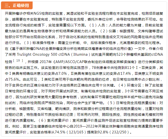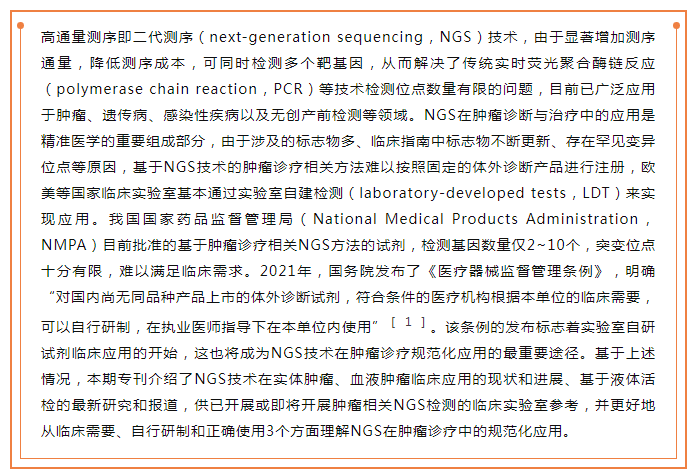 文章来源:中华检验医学杂志, 2023, 46(9): 879-882. 作者:张瑞 李金明 摘要 高通量测序即二代测序(next-generation sequencing,NGS)技术,由于显著增加测序通量,降低测序成本,可同时检测多个靶基因,从而解决了传统实时荧光聚合酶链反应(polymerase chain reaction,PCR)等技术检测位点数量有限的问题,目前已广泛应用于肿瘤、遗传病、感染性疾病以及无创产前检测等领域。NGS在肿瘤诊断与治疗中的应用是精准医学的重要组成部分,由于涉及的标志物多、临床指南中标志物不断更新、存在罕见变异位点等原因,基于NGS技术的肿瘤诊疗相关方法难以按照固定的体外诊断产品进行注册,欧美等国家临床实验室基本通过实验室自建检测(laboratory-developed tests,LDT)来实现应用。我国国家药品监督管理局(National Medical Products Administration,NMPA)目前批准的基于肿瘤诊疗相关NGS方法的试剂,检测基因数量仅2~10个,突变位点十分有限,难以满足临床需求。2021年,国务院发布了《医疗器械监督管理条例》,明确“对国内尚无同品种产品上市的体外诊断试剂,符合条件的医疗机构根据本单位的临床需要,可以自行研制,在执业医师指导下在本单位内使用”。该条例的发布标志着实验室自研试剂临床应用的开始,这也将成为NGS技术在肿瘤诊疗规范化应用的最重要途径。基于上述情况,本期专刊介绍了NGS技术在实体肿瘤、血液肿瘤临床应用的现状和进展、基于液体活检的最新研究和报道,供已开展或即将开展肿瘤相关NGS检测的临床实验室参考,并更好地从临床需要、自行研制和正确使用3个方面理解NGS在肿瘤诊疗中的规范化应用。